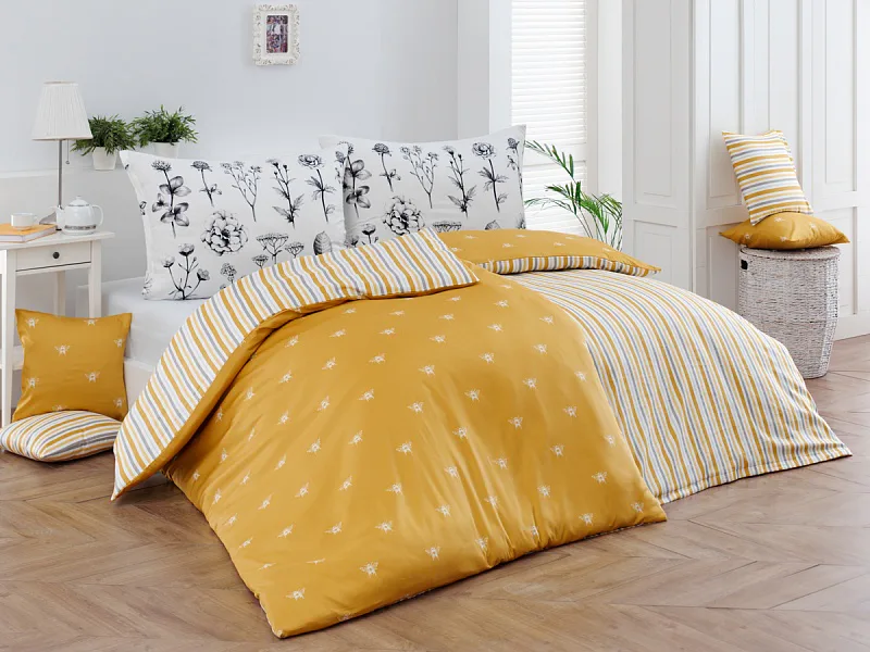 Modern colours, subtle motive of little bees, timeless stripes and fine floral drawing – all of this is our 100% cotton bed linen Adore, an elegant addition to your bedroom.The tiny white bees stand out from the warm honey gold colour on the upper side of the blanket cover.The bottom side of the blanket cover is printed with golden, light yellow, white and light grey stripes.The pillowcase is decorated with fine drawing of wild flowers from both sides.Small pillowcases 40/40 are made from fabric by the yard and they are available in both patterns – bees and stripes. Every piece is slightly different.