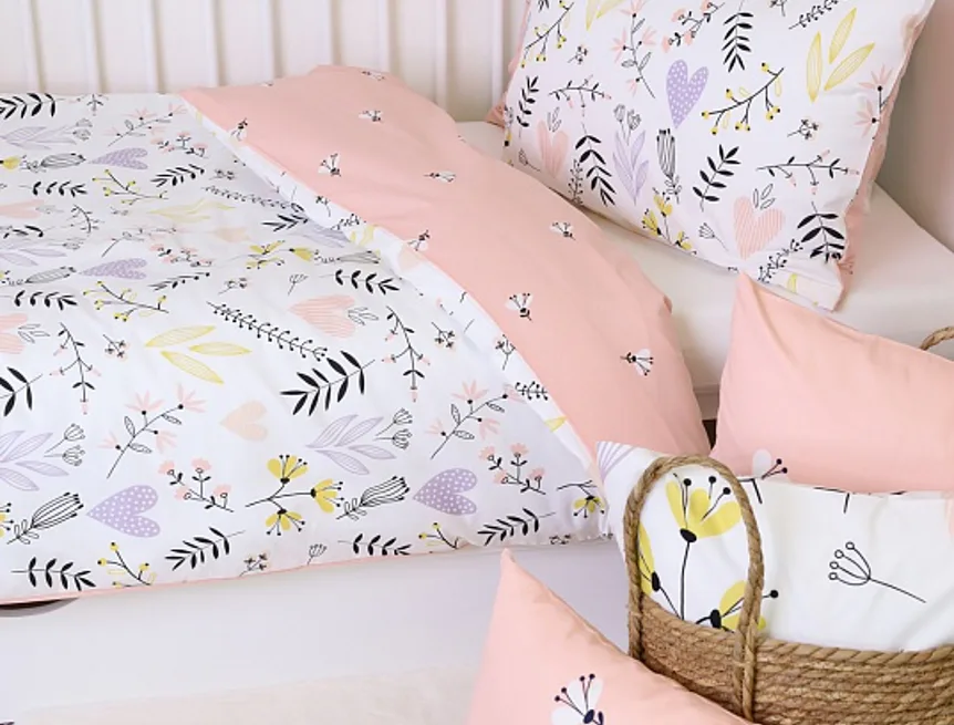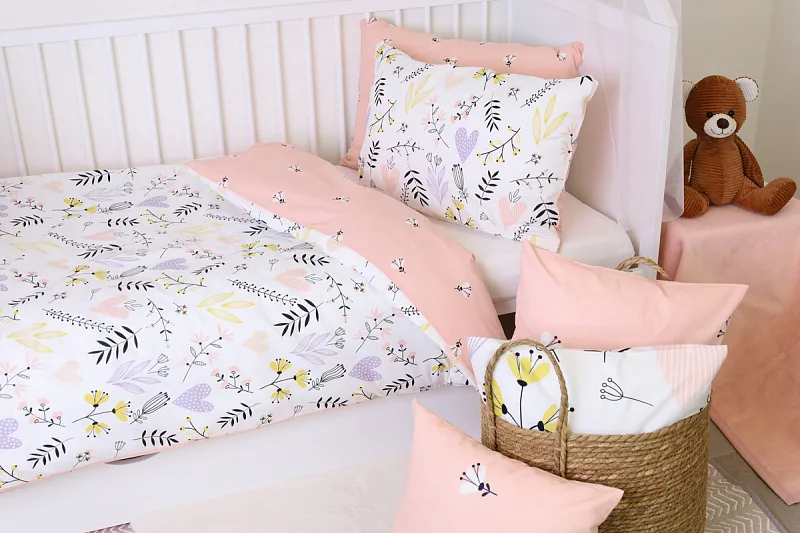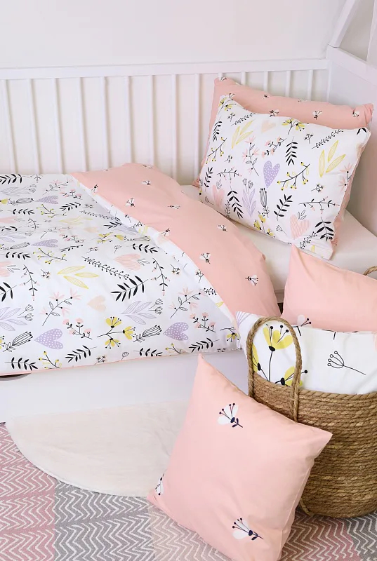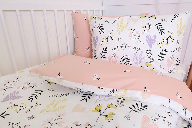 The pillow and blanket cover is decorated on the top with a pattern of flowers and hearts, the underside is studded with a motif of small black and white flowers on a light pink background.
