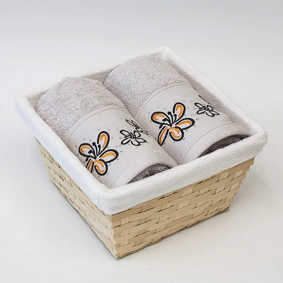 Košík s froté textilní vsadkou obsahuje 2 ks bavlněných ručníků o rozměrech 50x100 cm. Ručník je opatřen krásnou moderní výšivkou. Košík je součástí balení.