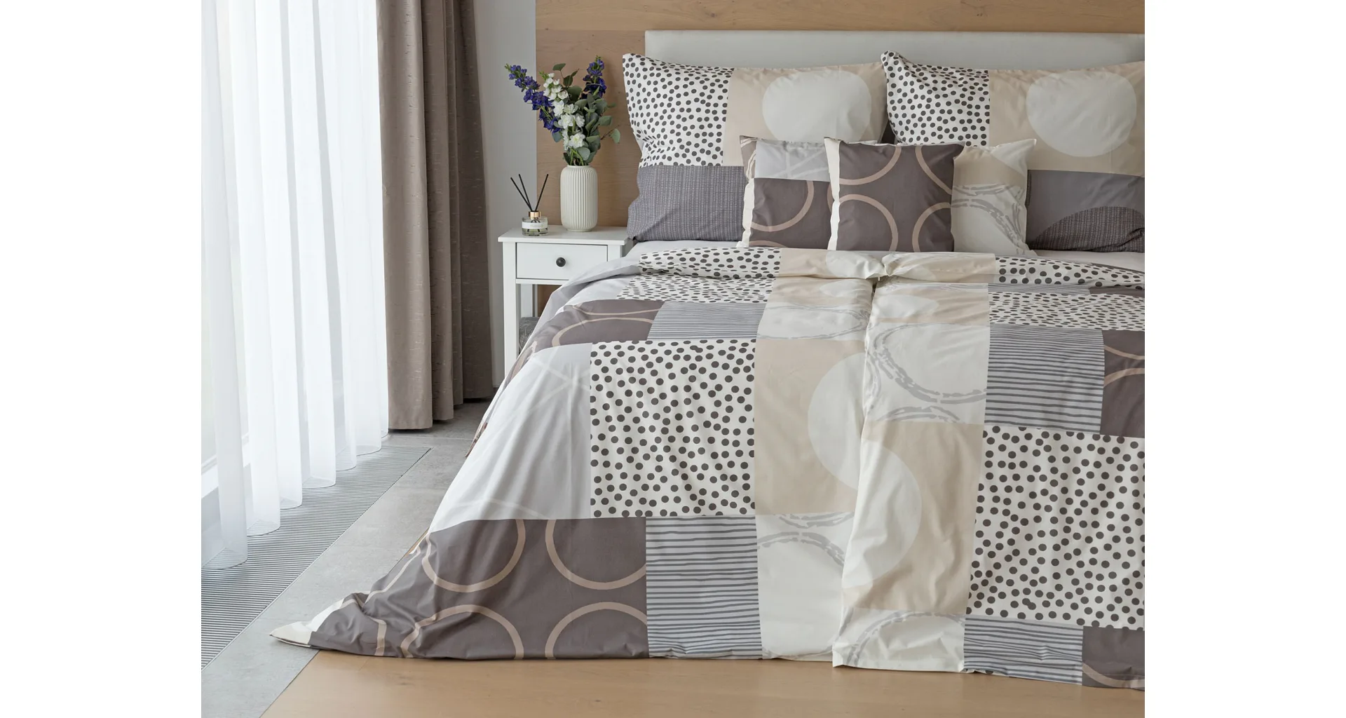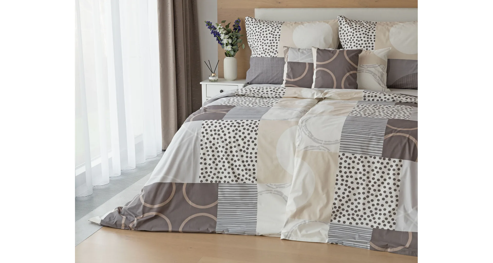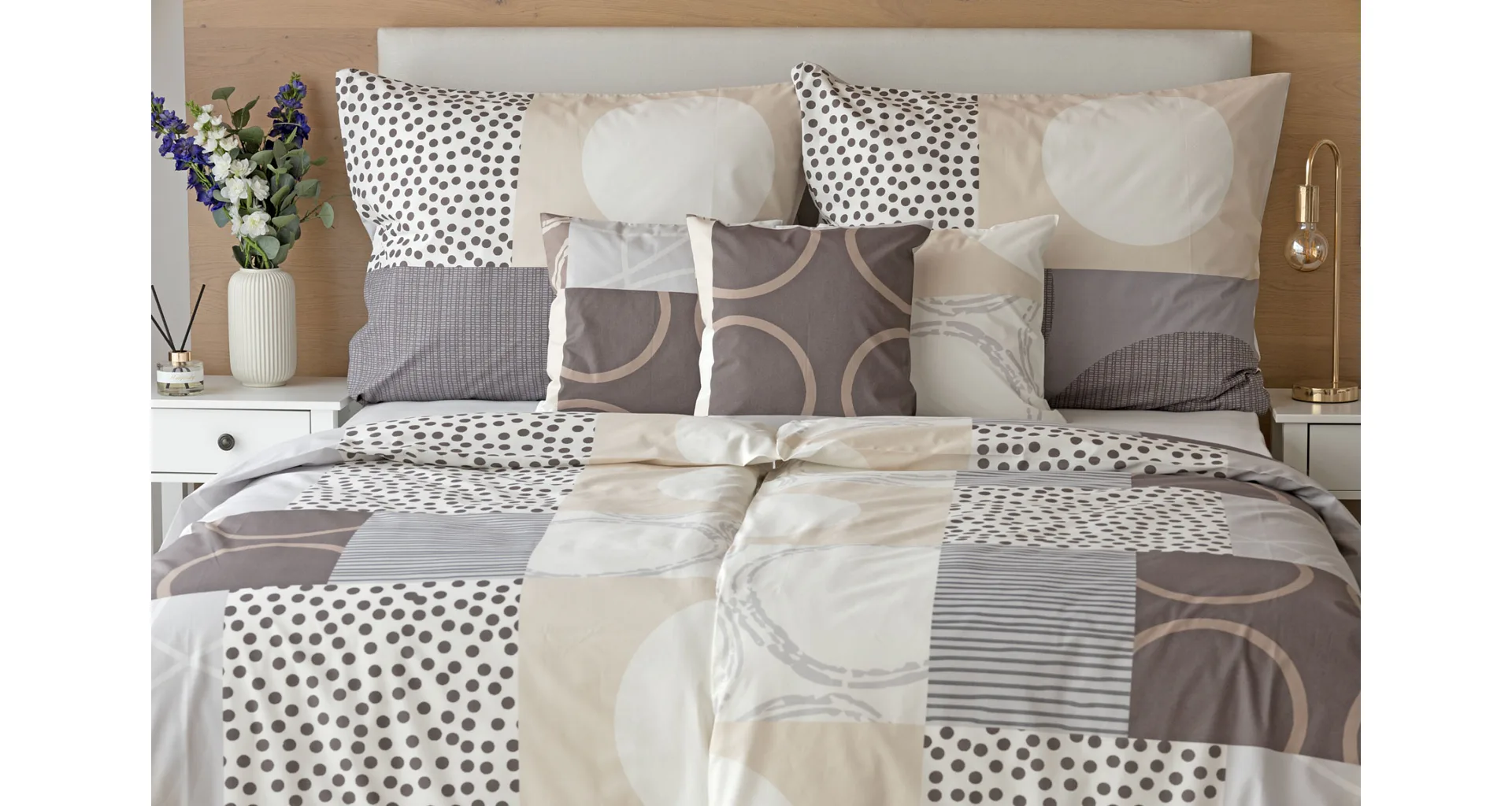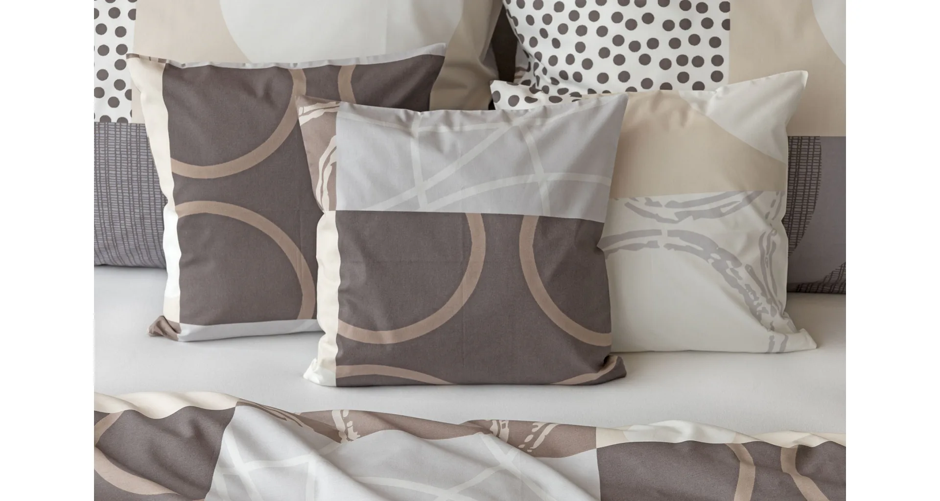 The modern geometric pattern of Brenton bedding combines subtle shades of brown, beige and grey on a creamy white background.