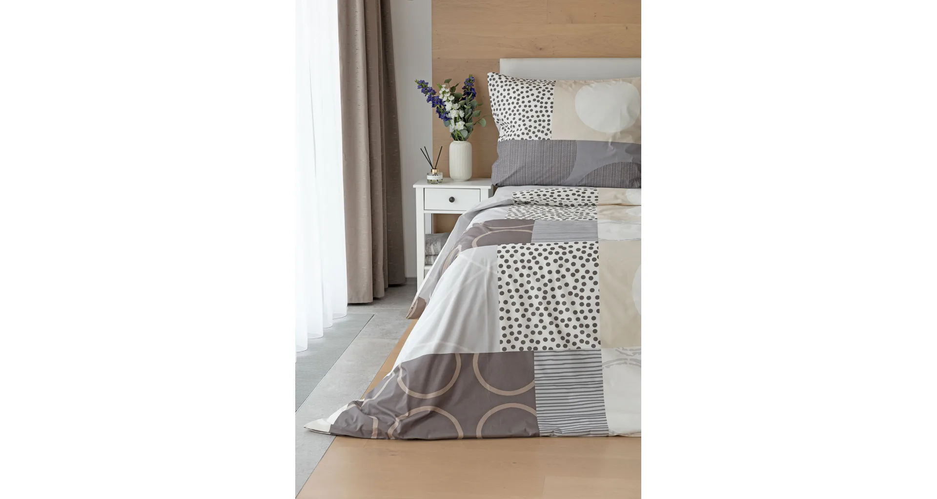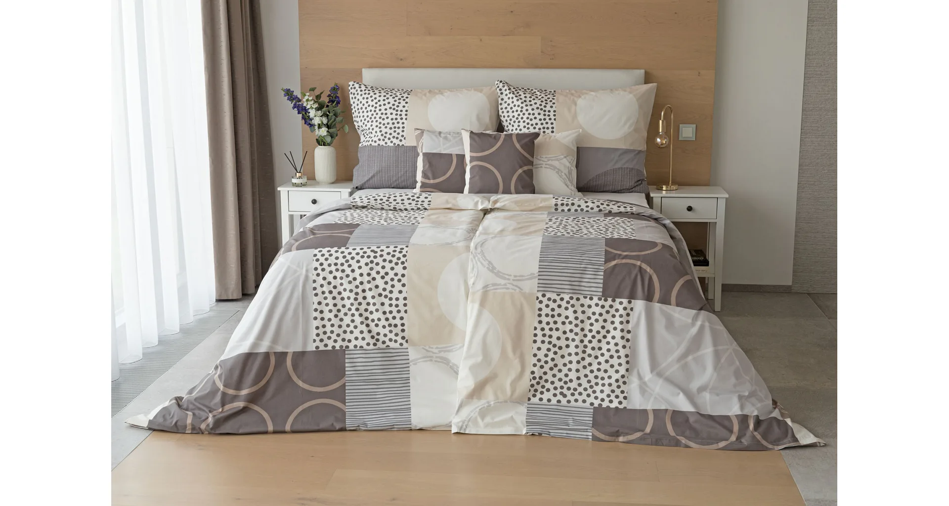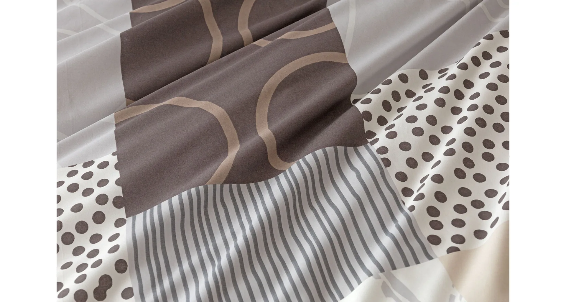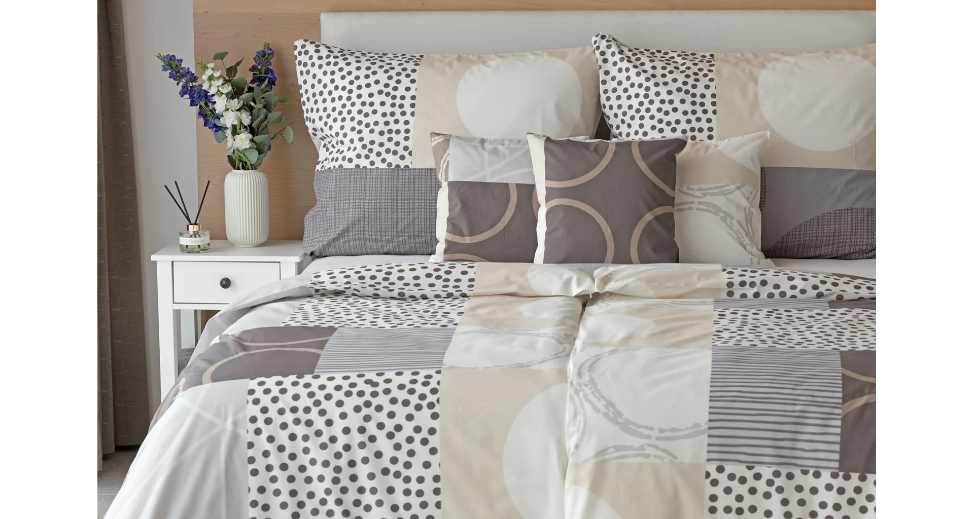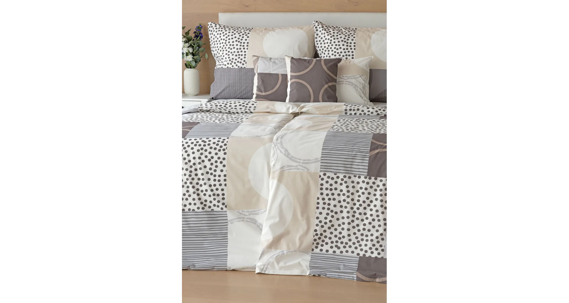The modern geometric pattern of Brenton bedding combines subtle shades of brown, beige and grey on a creamy white background.