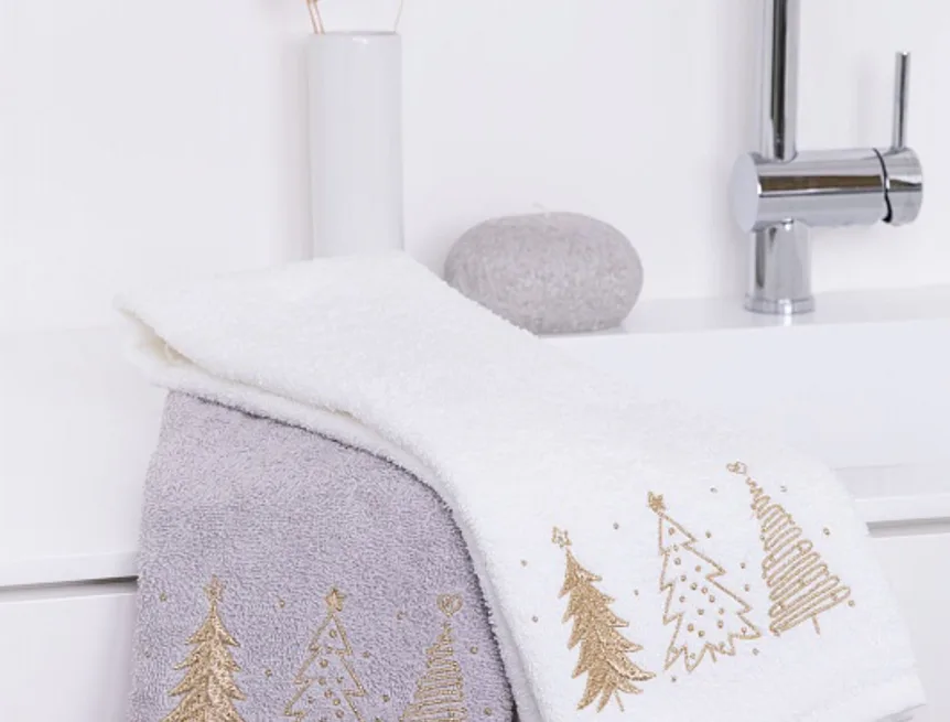 • bílý ručník, výšivka s motivem zlatých stromků