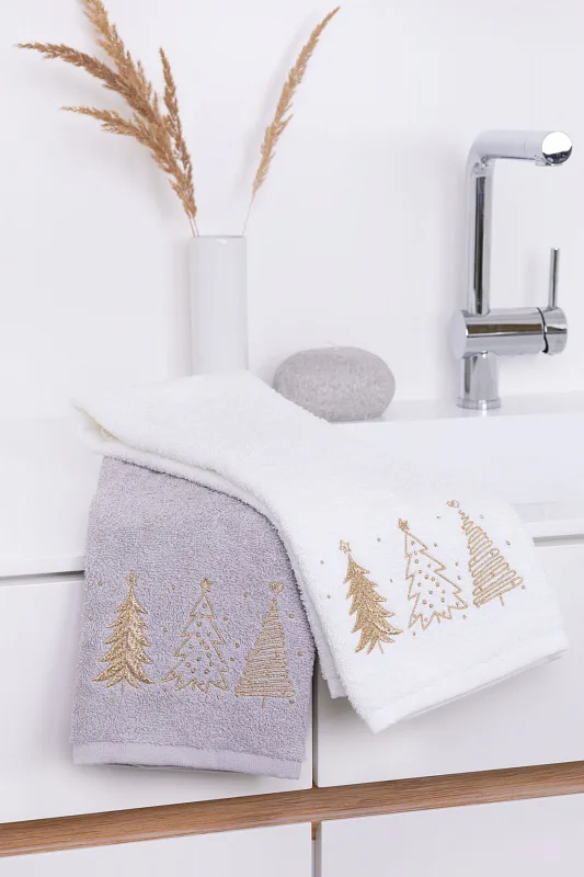 • šedý ručník, výšivka s motivem zlatých stromků