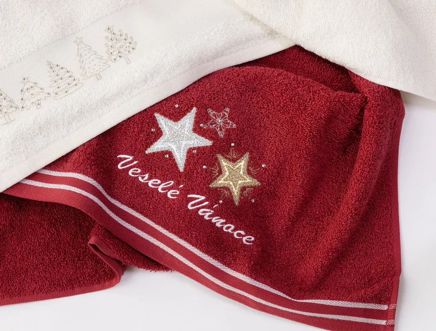 • červený ručník, výšivka s vánočním motivem