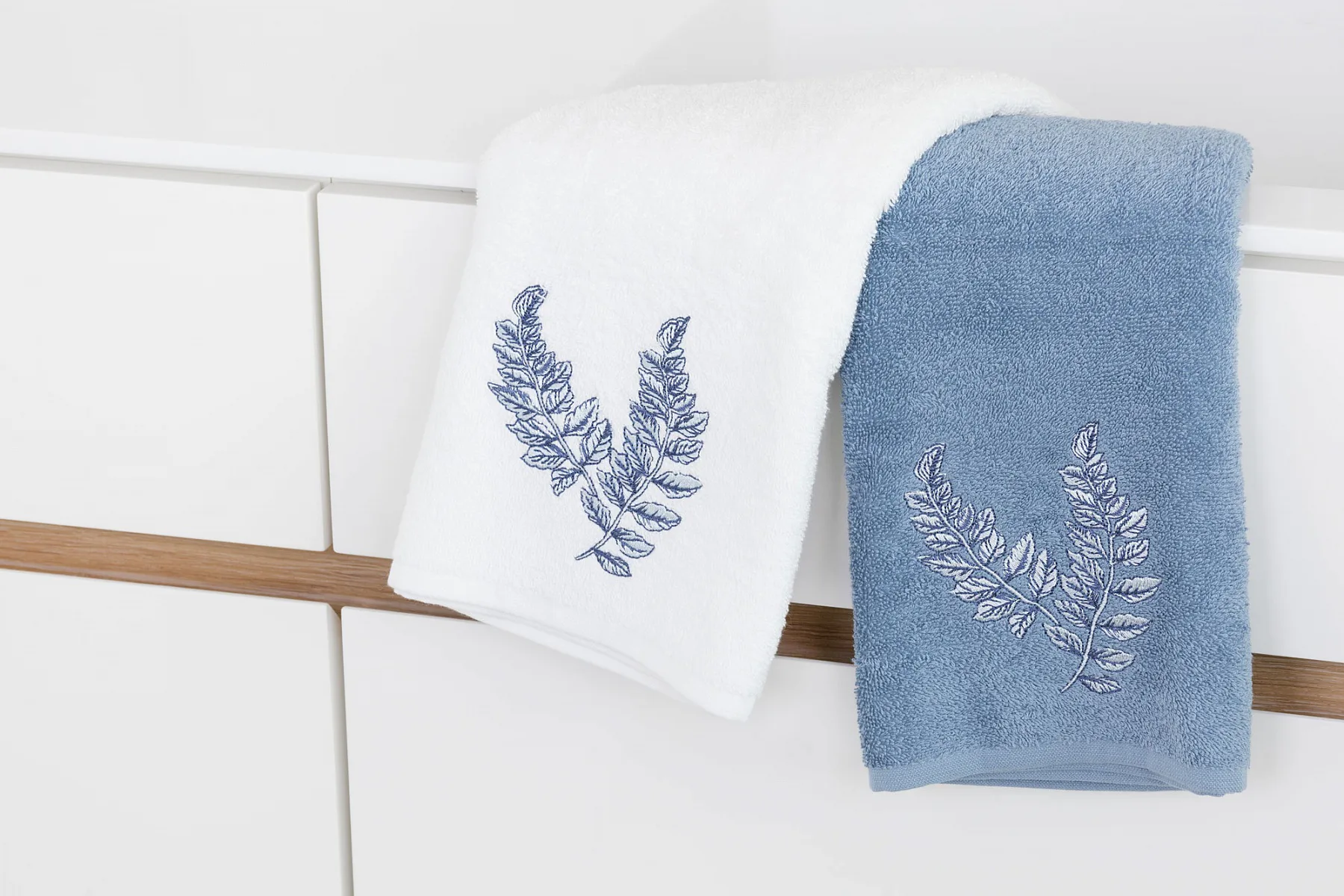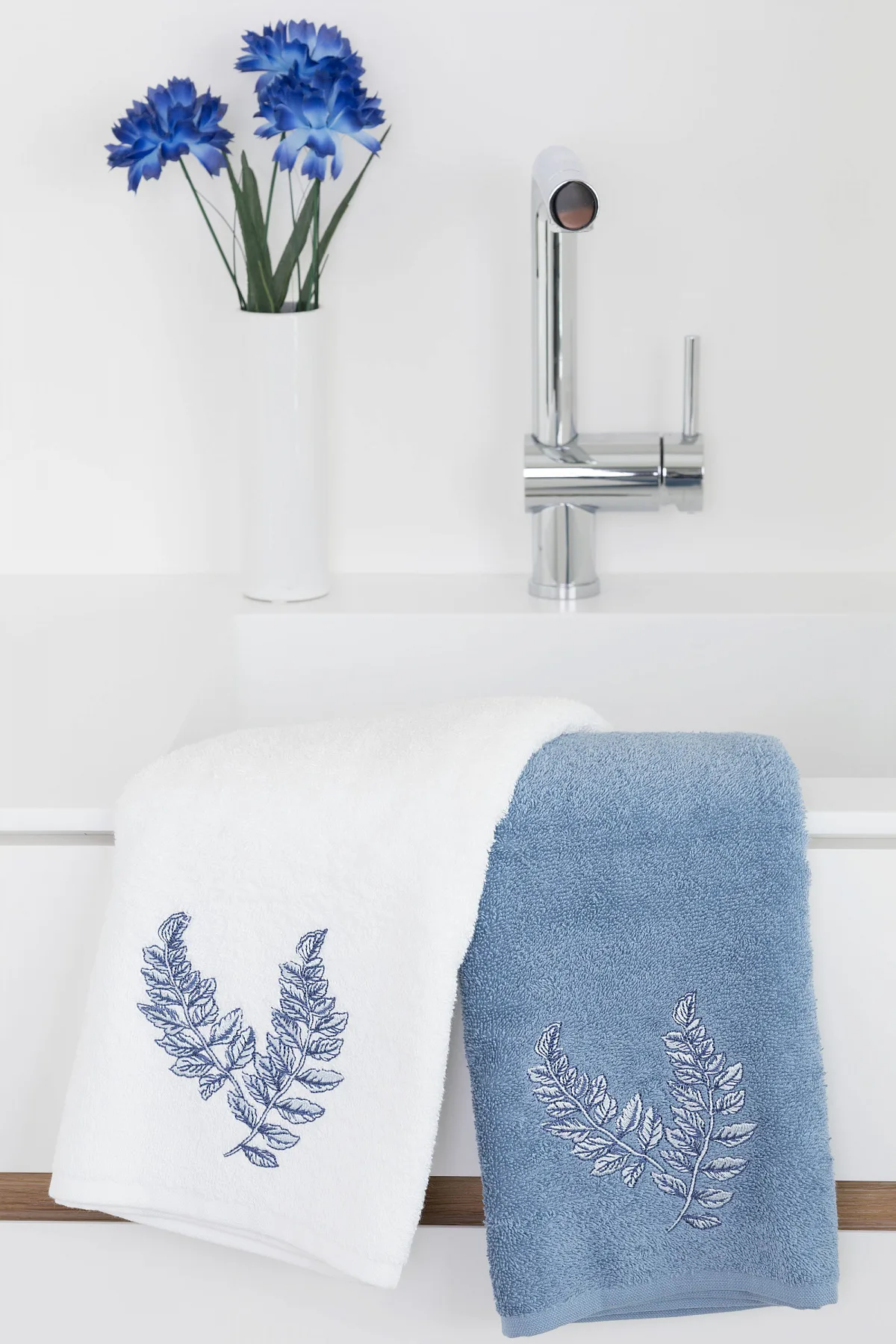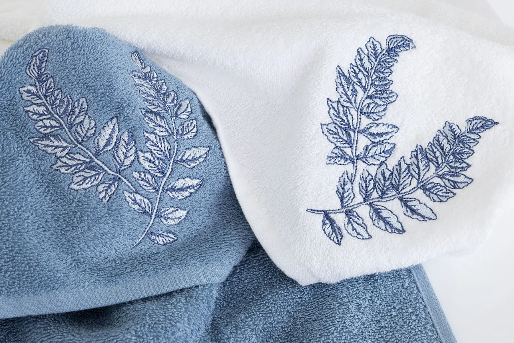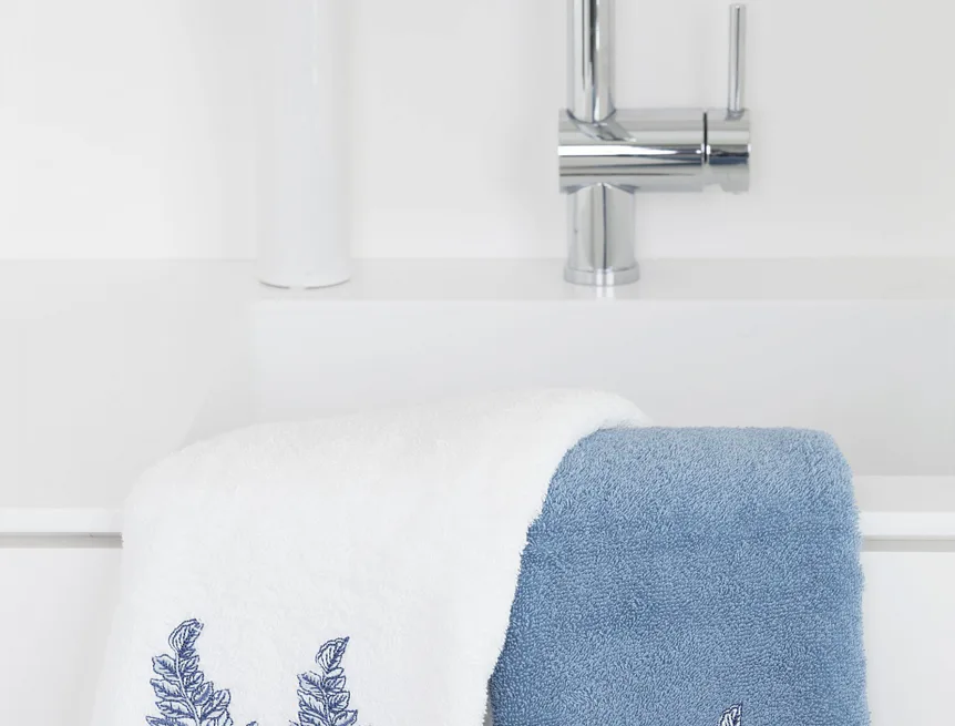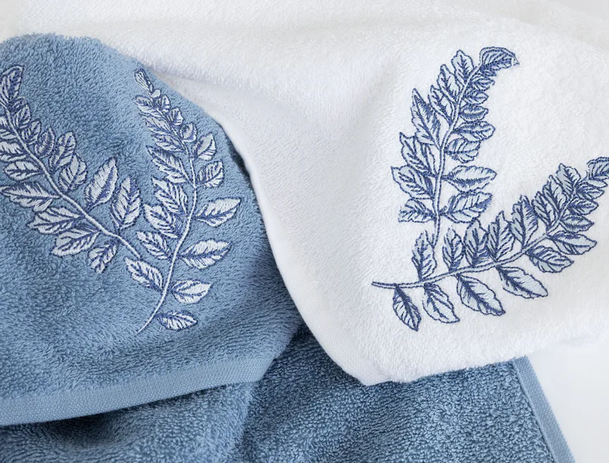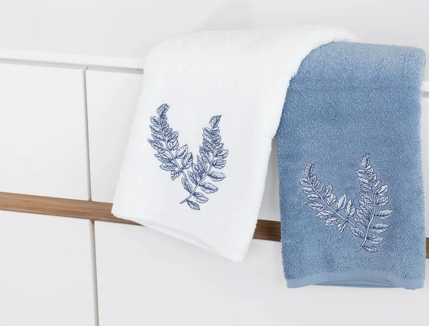 • pastelově modrý ručník, výšivka s florálním motivem