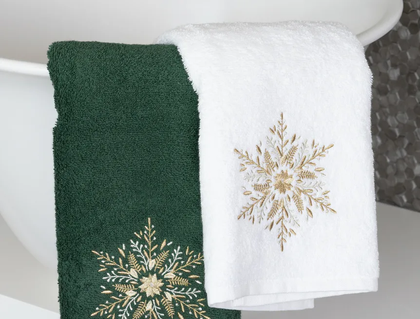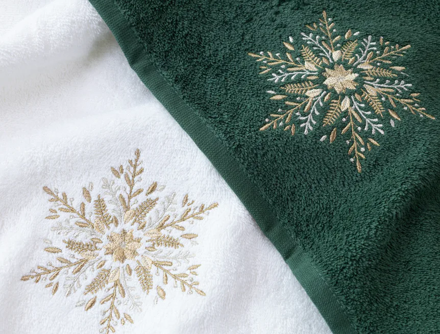• zelený ručník, výšivka s motivem sněhové vločky