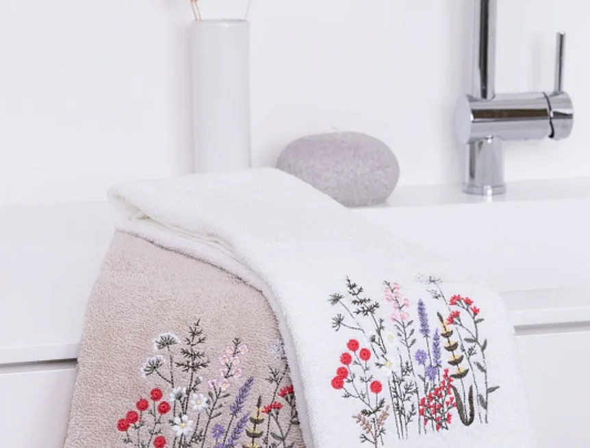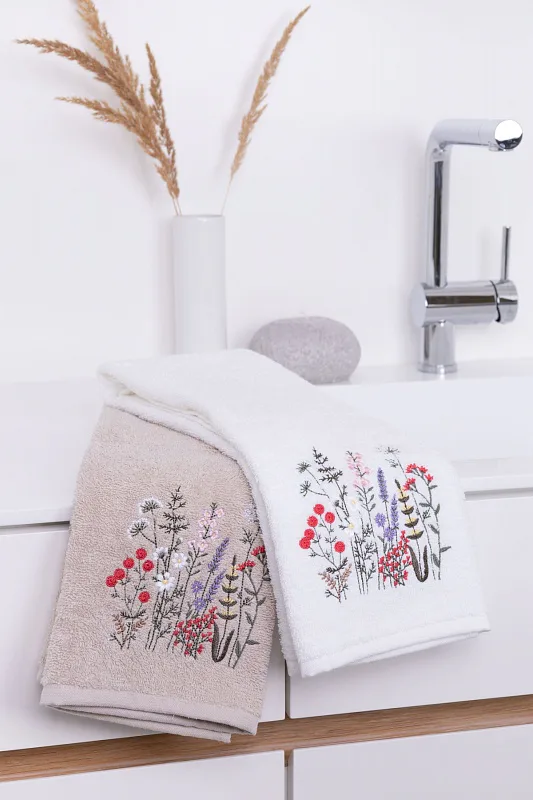 • béžový ručník, výšivka s motivem lučního kvítí