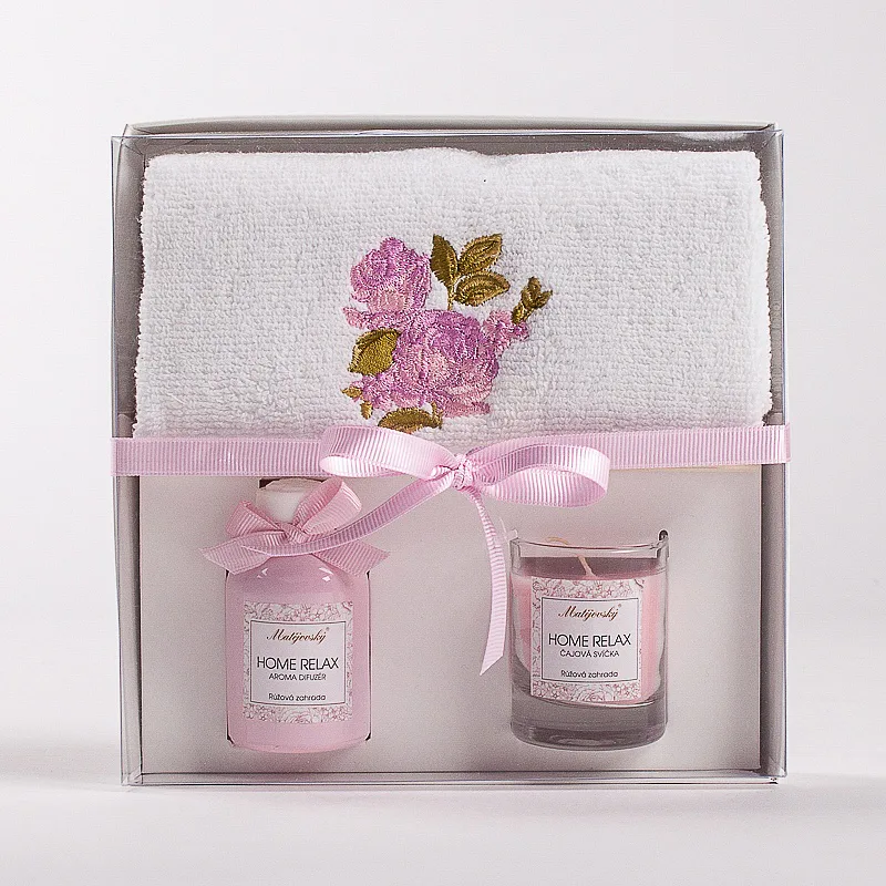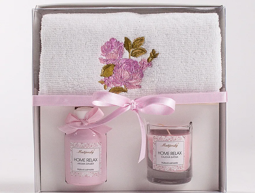 Dárkově balený set ručníku, svíčky ve skle a vonného difuzéru potěší každého milovníka praktických dárků.
