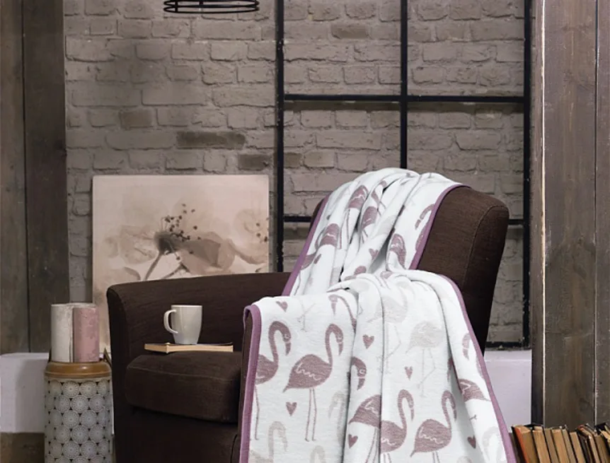 Luxusní bavlněná deka s hustým vlasem, hřejivá a hebká na omak. Nová receptura tkaní je zárukou lehkosti a skvělé prodyšnosti. Deka DARK FLAMINGO bude jedinečným doplňkem vašeho domova a nepostradatelným společníkem pro chladné večery. Atraktivní, ale přesto velmi něžný motiv s plameňáky v hnědofialové a béžové barvě na přírodním bílém podkladu zaujme každého vyznavače současných trendů. Spodní strana deky je provedena inverzně.