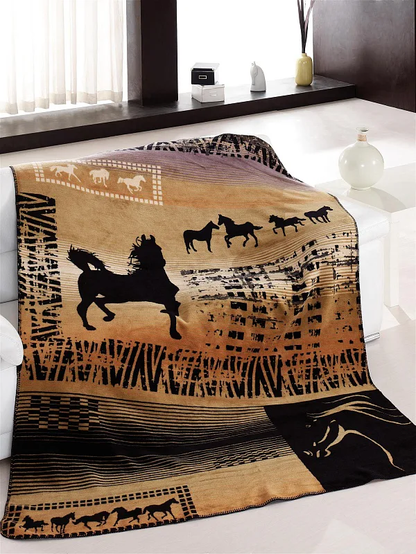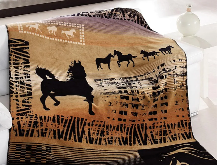 Luxusní deka GUINEA s hustým vlasem, hřejivá a sametová na omak. Atraktivní dezén zajistí, že deka bude jedinečným doplňkem vašeho domova a nepostradatelným společníkem pro chladné večery. Černé siluety koní zajímavě kontrastují s nugátově hnědými a béžovými tóny.