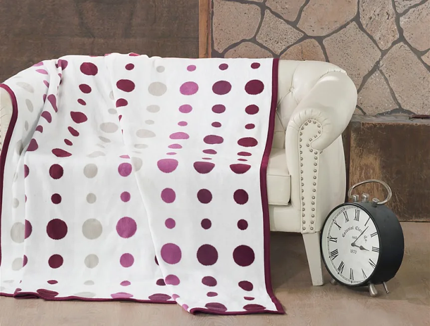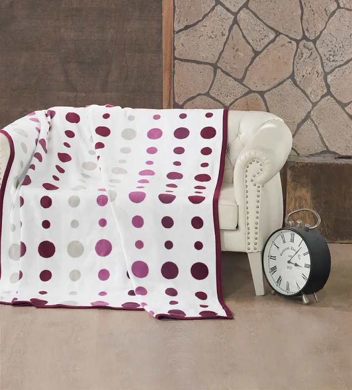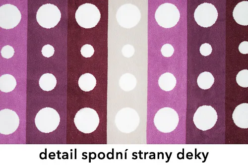 Luxusní bavlněná deka s hustým vlasem, hřejivá a hebká na omak. Oblíbený dezén MODERN ART LILA bude jedinečným doplňkem vašeho domova a nepostradatelným společníkem nejen pro chladné večery. Světle a tmavě fialové a šedé puntíky na bílém podkladu. Druhou stranu deky pokrývají svislé pruhy s bílými puntíky (viz další foto).