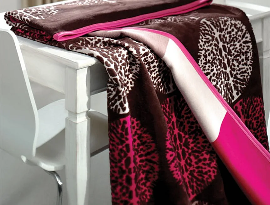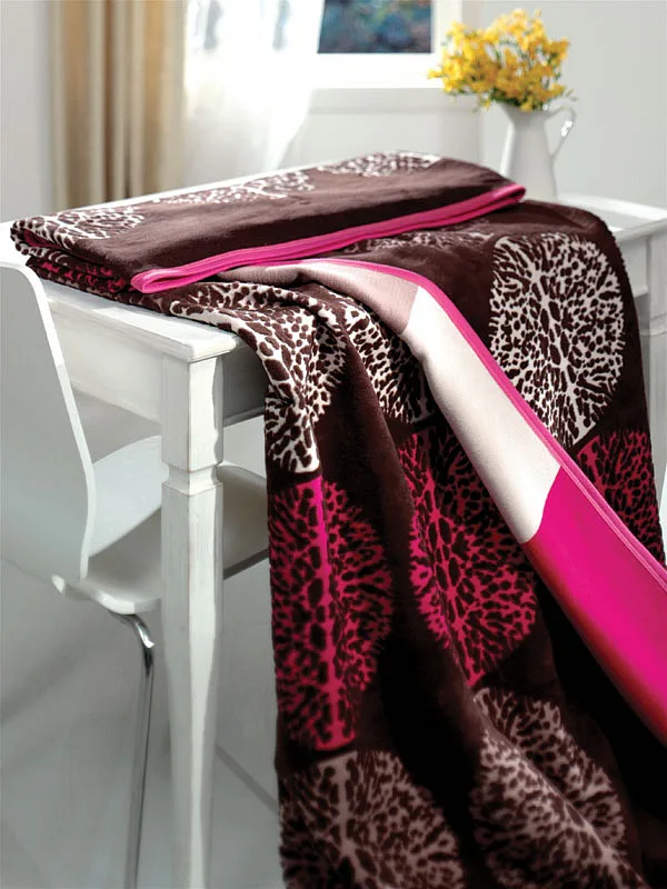 Luxusní bavlněná deka s moderním vzorem a jemnou barevnou kombinací růžové a hnědé bude skvělým stylovým doplňkem Vašeho domova a také hřejivým společníkem pro chladné večery.