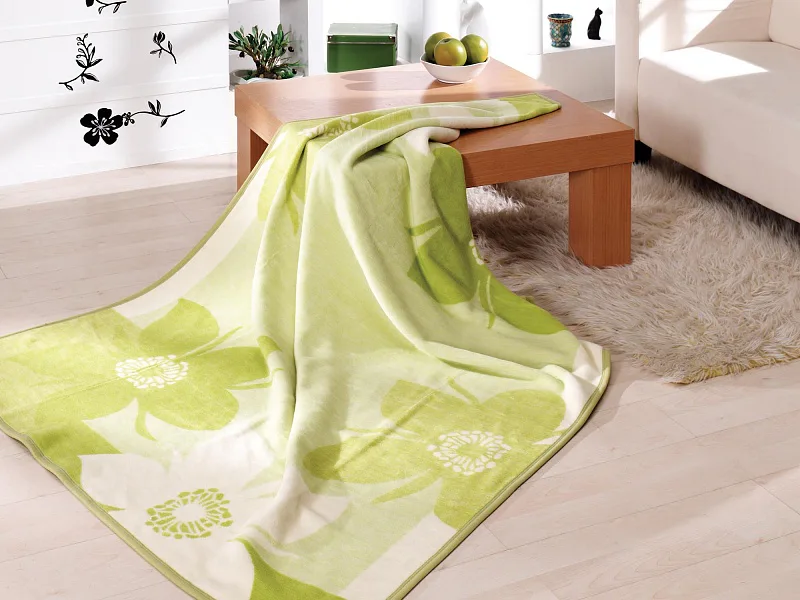 Deku můžete elegantně využít také jako ozdobný přehoz. Deka je olemována zelenou lemovkou.