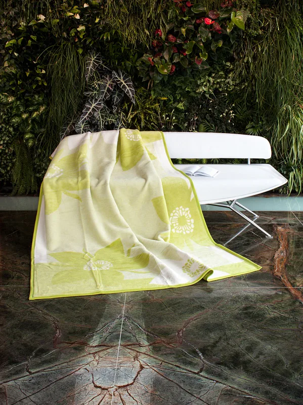 Květinový vzor deky v tónech jarní svěží zelené a krémové.
