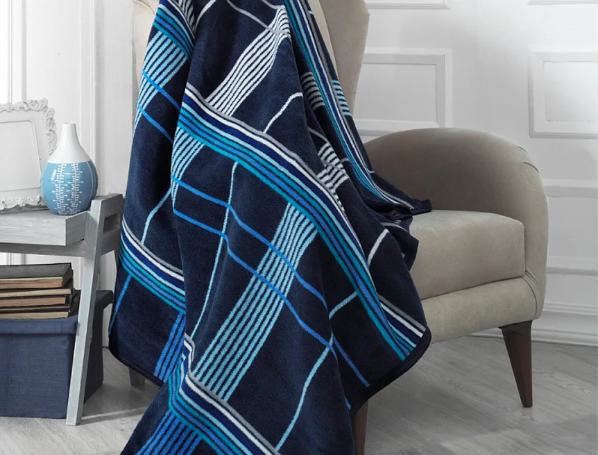 Luxusní bavlněná deka s hustým vlasem, hřejivá a hebká na omak. Nová receptura tkaní je zárukou lehkosti a skvělé prodyšnosti. Deka RIA bude jedinečným doplňkem vašeho domova a nepostradatelným společníkem pro chladné večery. Odlehčený kárový vzor v pastelových odstínech středně modré, tyrkysové a šedé se vyjímá na temném modrém podkladu. Spodní strana deky je provedena inverzně.