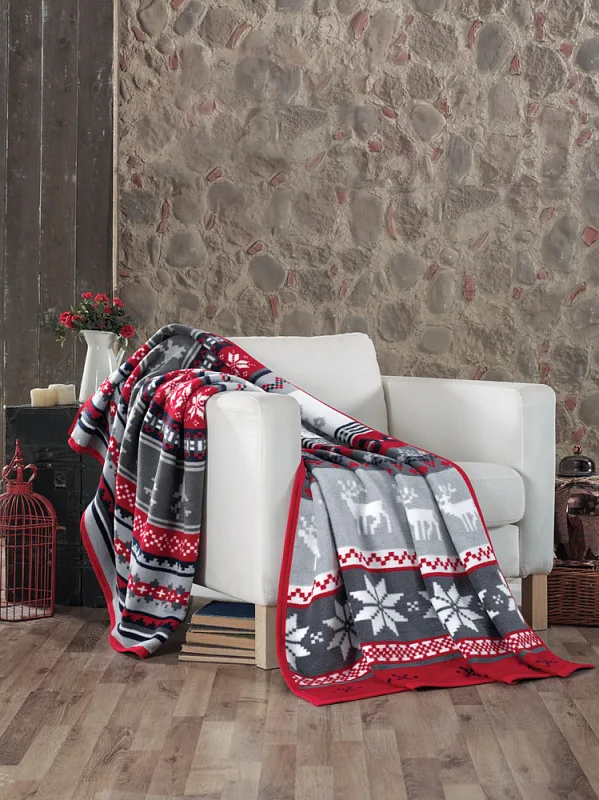 Luxusní bavlněná deka s hustým vlasem, hřejivá a hebká na omak. Nová receptura tkaní je zárukou lehkosti a skvělé prodyšnosti. Deka SCANDIK bude jedinečným doplňkem vašeho domova a nepostradatelným společníkem pro chladné večery. Vánoční motiv ve skandinávském provedení vyniká zajímavou kombinací vínové, šedé a bílé. Spodní strana deky je provedena inverzně.