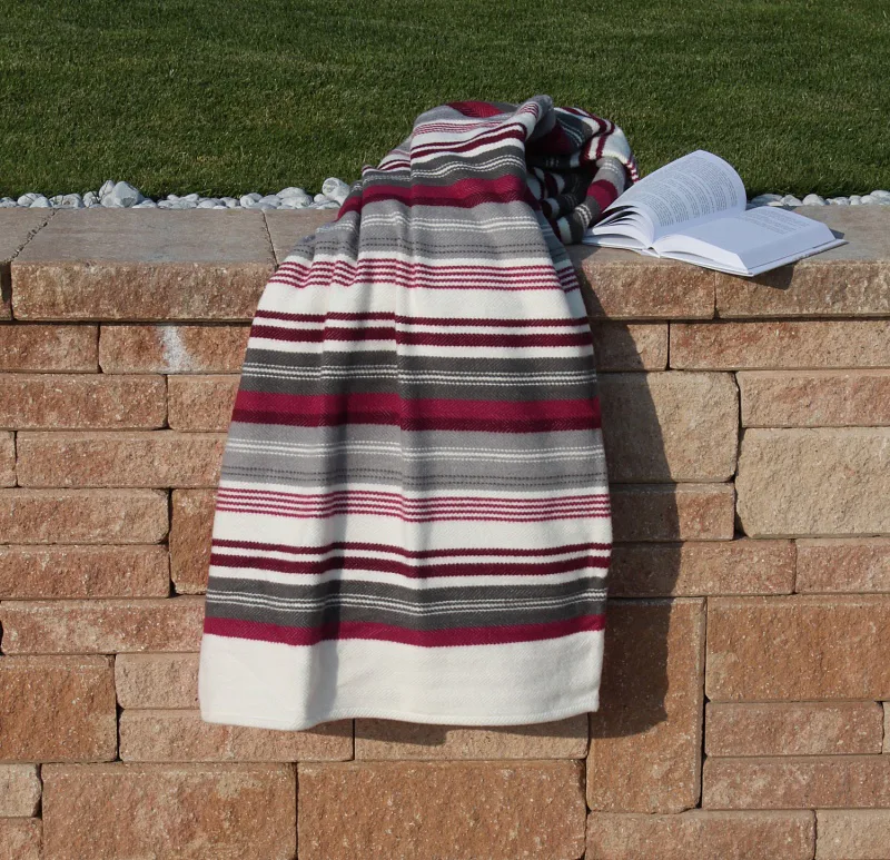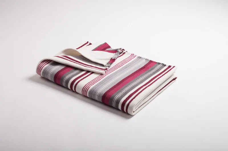 Hravé a jednoduše nadčasové proužky v kombinaci s jemnými pastelovými tóny, vystihují novou kolekci letních dek. Mimořádně měkký a jemný povrch si budete rádi užívat nejen o chladných letních večerech. Na bílém podkladu se střídají různě široké proužky šedých a vínových tónů. Deka má dva konce zapošité a dva volné.