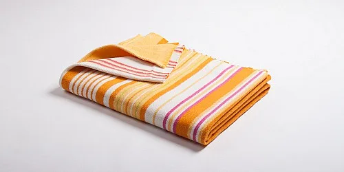 Hravé a jednoduše nadčasové proužky v kombinaci s jemnými pastelovými tóny, vystihují novou kolekci letních dek. Mimořádně měkký a jemný povrch si budete rádi užívat nejen o chladných letních večerech. Veselá kombinace různých pruhů teplé žluté barvy, bílé a oranžové, doplněná o pink růžové proužky. Deka má dva konce zapošité a dva volné.