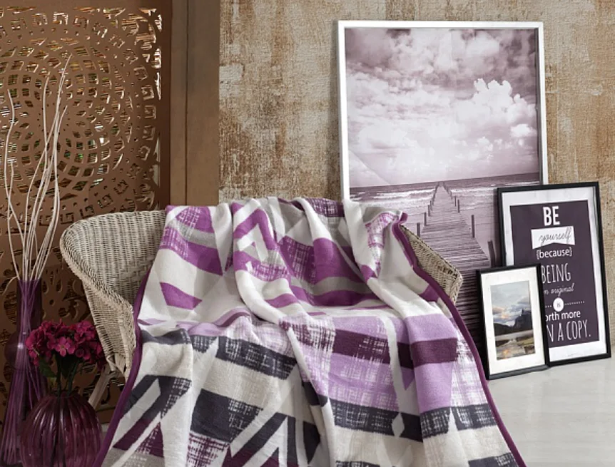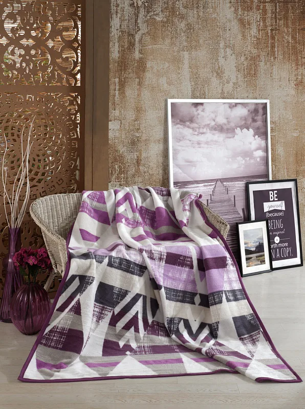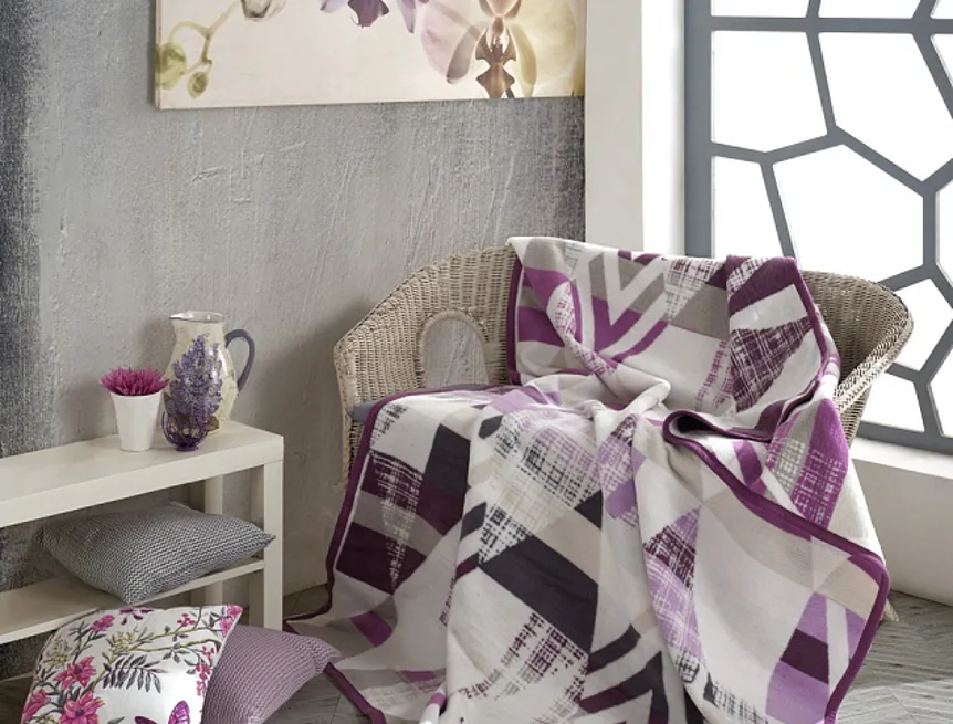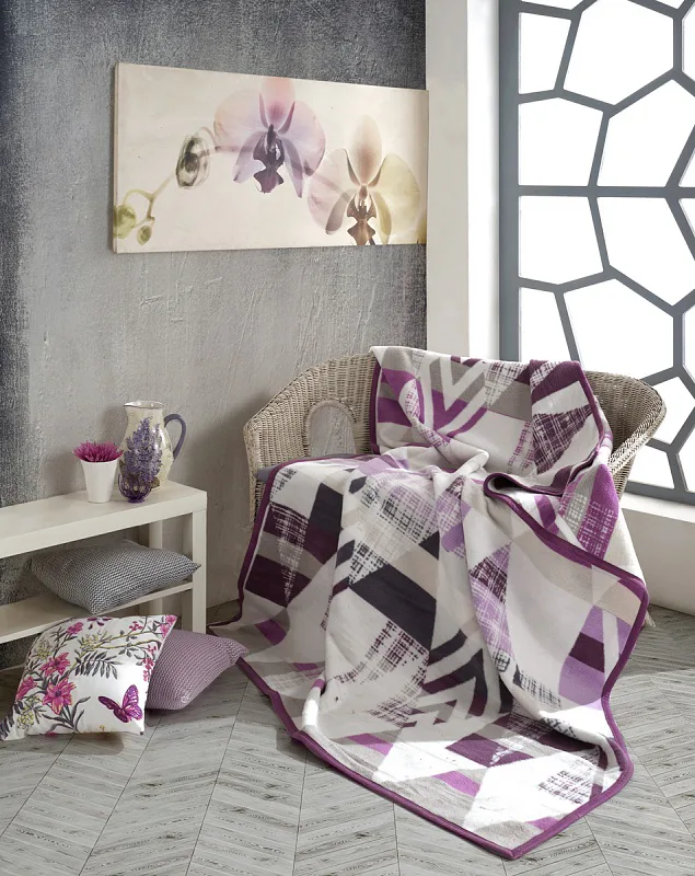Luxusní bavlněná deka s hustým vlasem, hřejivá a hebká na omak. Nová receptura tkaní je zárukou lehkosti a skvělé prodyšnosti. Deka Suri se stane jedinečným doplňkem vašeho domova a nepostradatelným společníkem pro chladné večery. Svěží geometrický vzor ve fialových, světle šedých a antracitových tónech na smetanově bílém podkladu doladí každý moderní interiér.
