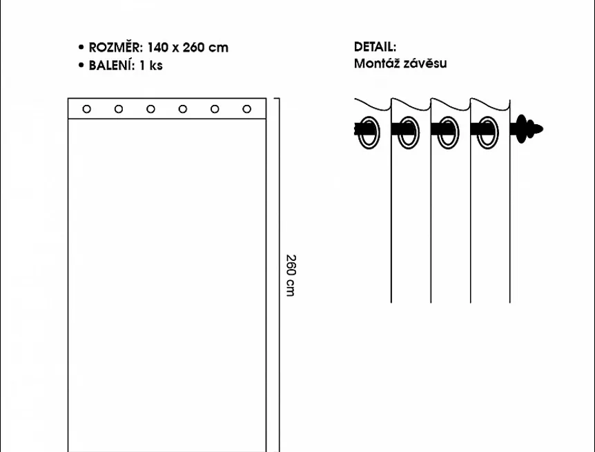Balení: 1 ks závěsu, včetně kovových ok, pro pohodlné zavěšení na tyč (vnitřní rozměr oka - 4 cm)