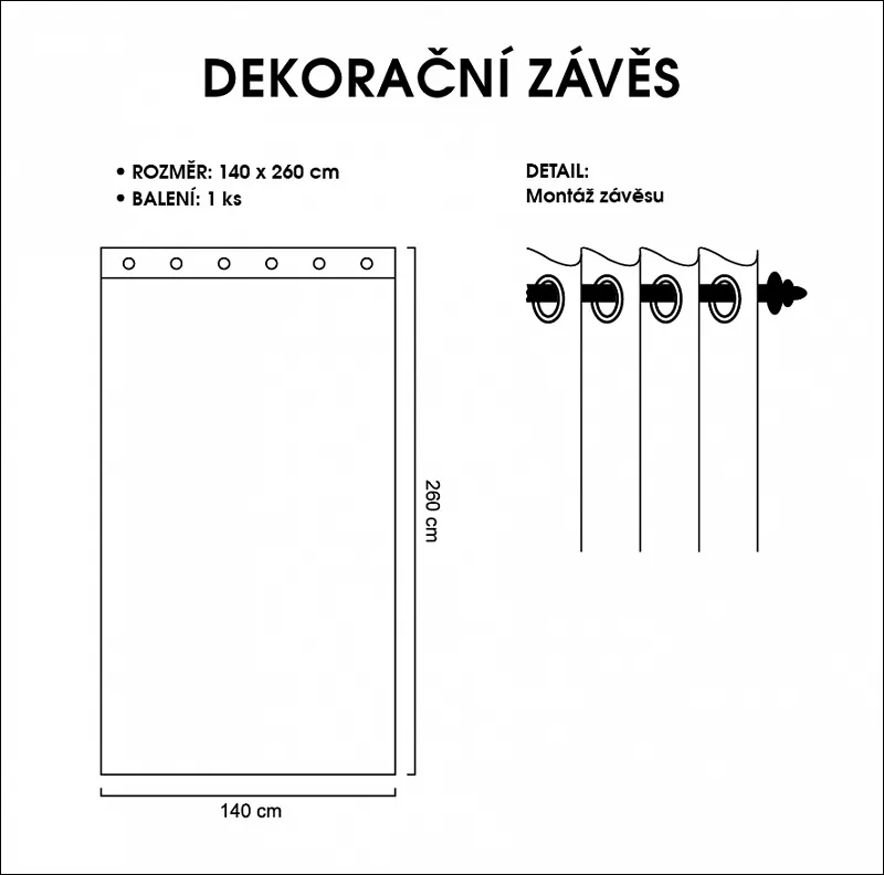 Balení: 1 ks závěsu, včetně kovových ok, pro pohodlné zavěšení na tyč (vnitřní rozměr oka - 4 cm)