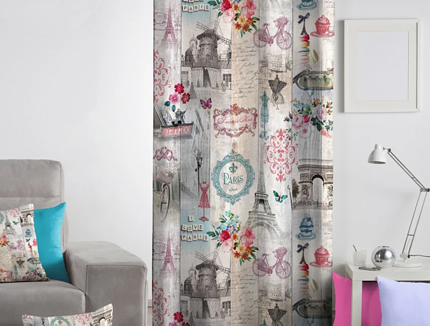 Exkluzivní kolekce dekoračních závěsů přináší mimořádný zážitek a věrné provedení detailu. To vše díky nejmodernější digitální technologii tisku. Jestli patříte mezi příznivce romantické Paříže, nechte se okouzlit závěsem PARIS DE SALON. Okouzlující jemné pastelové tóny růžové, šedé a petrolejové na světlém podkladu prozáří každý okamžik. Jistě oceníte i látku s velmi hustou a pevnou strukturou, vyrobenou ze 100% bavlny, opatřenou sametovým povrchem. Potisk je jednostranný.