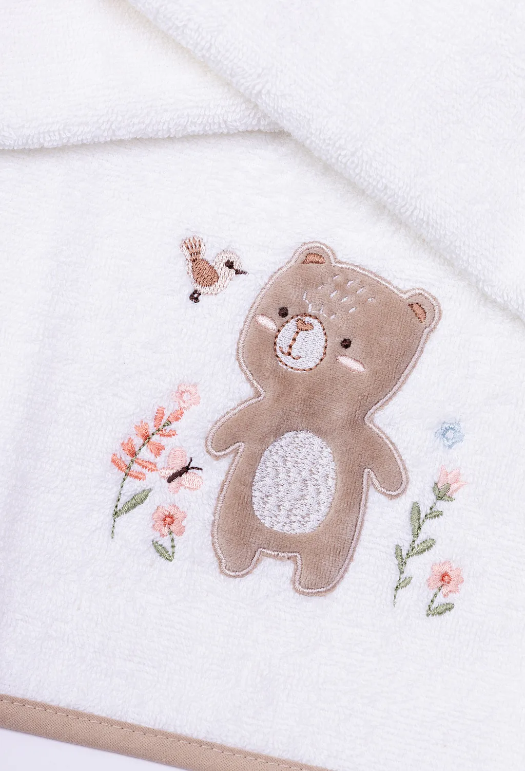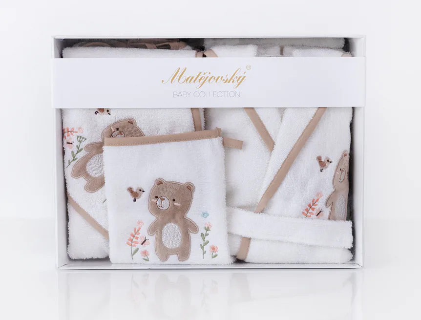Kromě praktičnosti a využitelnosti všech doplňků přináší tento set i okouzlující design, který podtrhují propracované roztomilé výšivky a barevně sladěné lemování. Dárková froté výbavička Méďa s výšivkou hravého medvídka je díky béžovému lemování neutrální a hodí se pro děvčátka i chlapce.