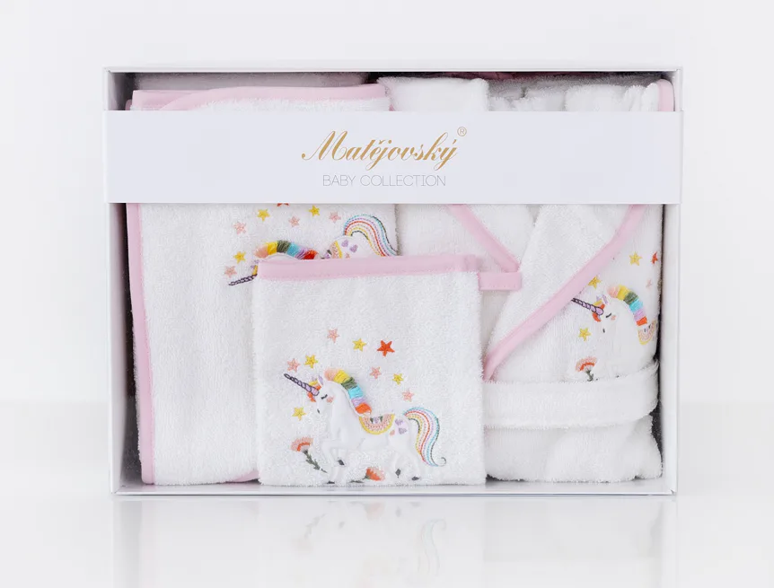 Kromě praktičnosti a využitelnosti všech doplňků přináší tento set i okouzlující design, který podtrhují propracované roztomilé výšivky a barevně sladěné lemování. Dárková froté výbavička Unicorn s výšivkou oblíbeného jednorožce je díky růžovému lemování vhodná pro malé princezny.