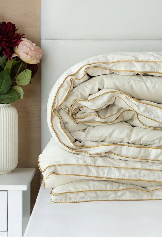 The blanket from the Kapok range is amazingly fluffy and supple. The cover is made of 100% cotton, the stability of the filling is ensured by stitching over the entire surface of the blanket. The edges are lined with a double decorative piping in gold color.