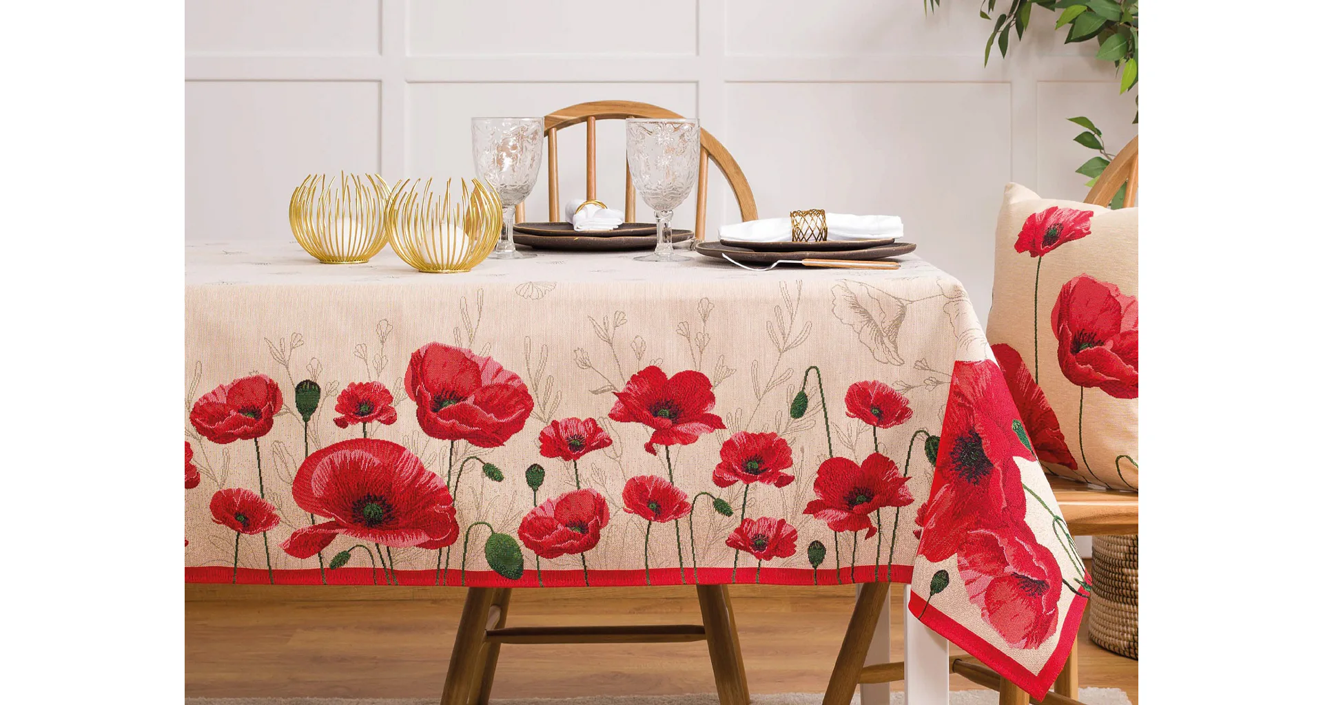 Ubrus Flanders s výraznými květy vlčích máků je ideální doplněk pro každou příležitost. Atraktivní design s rustikálním nádechem se pojí s praktičností díky pevnému a odolnému materiálu.