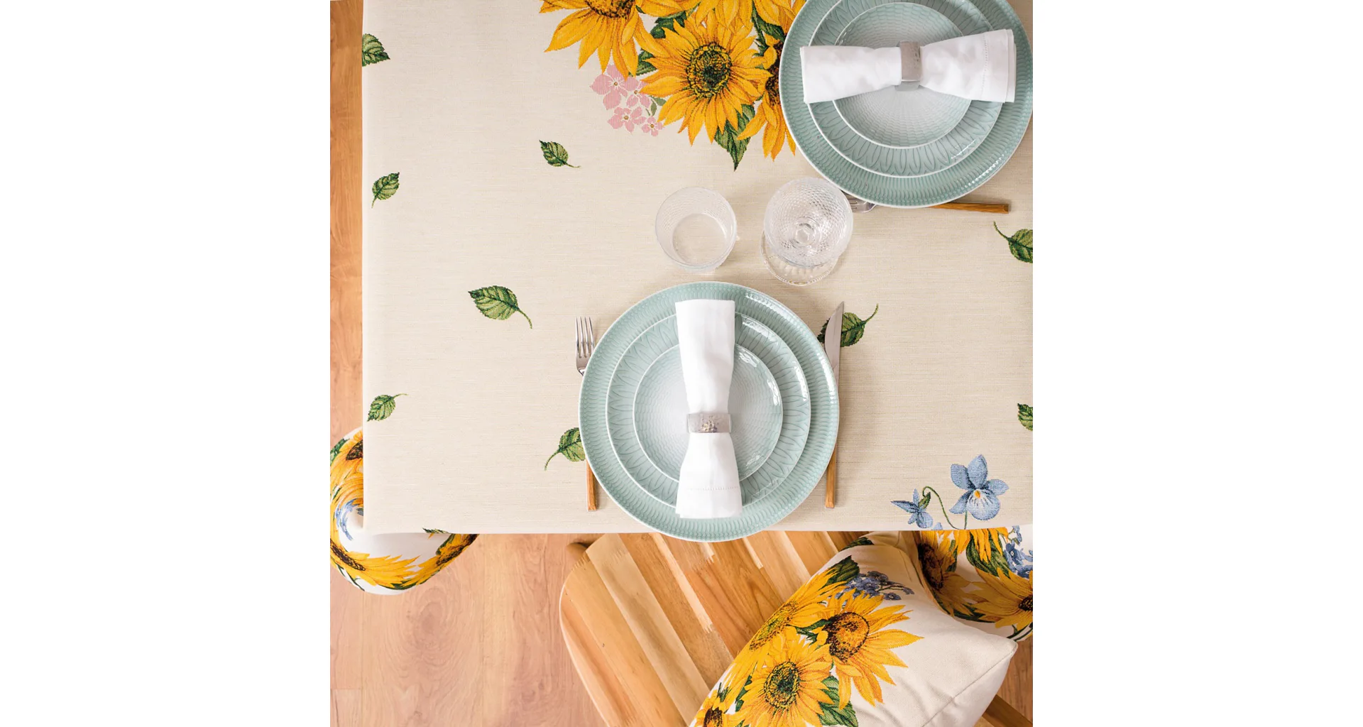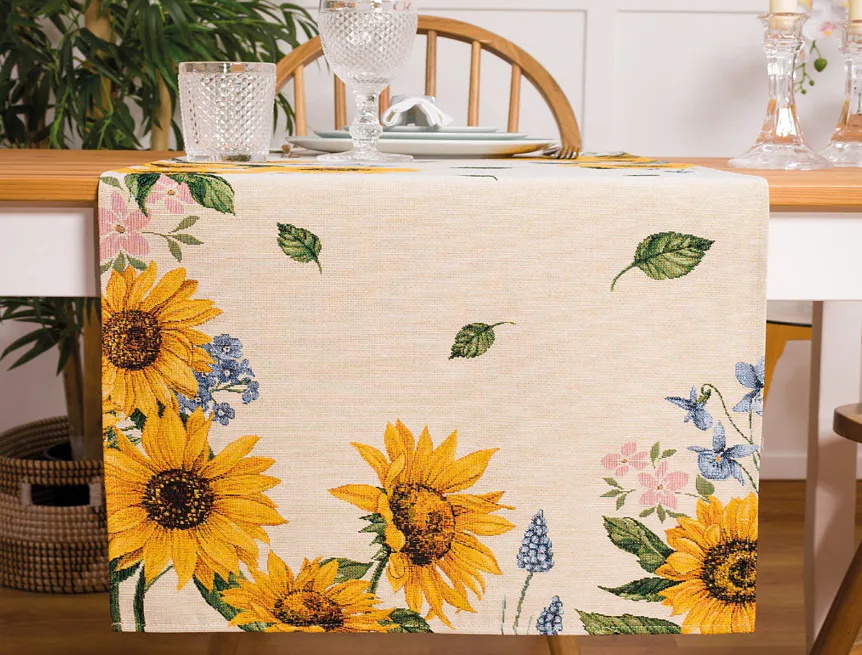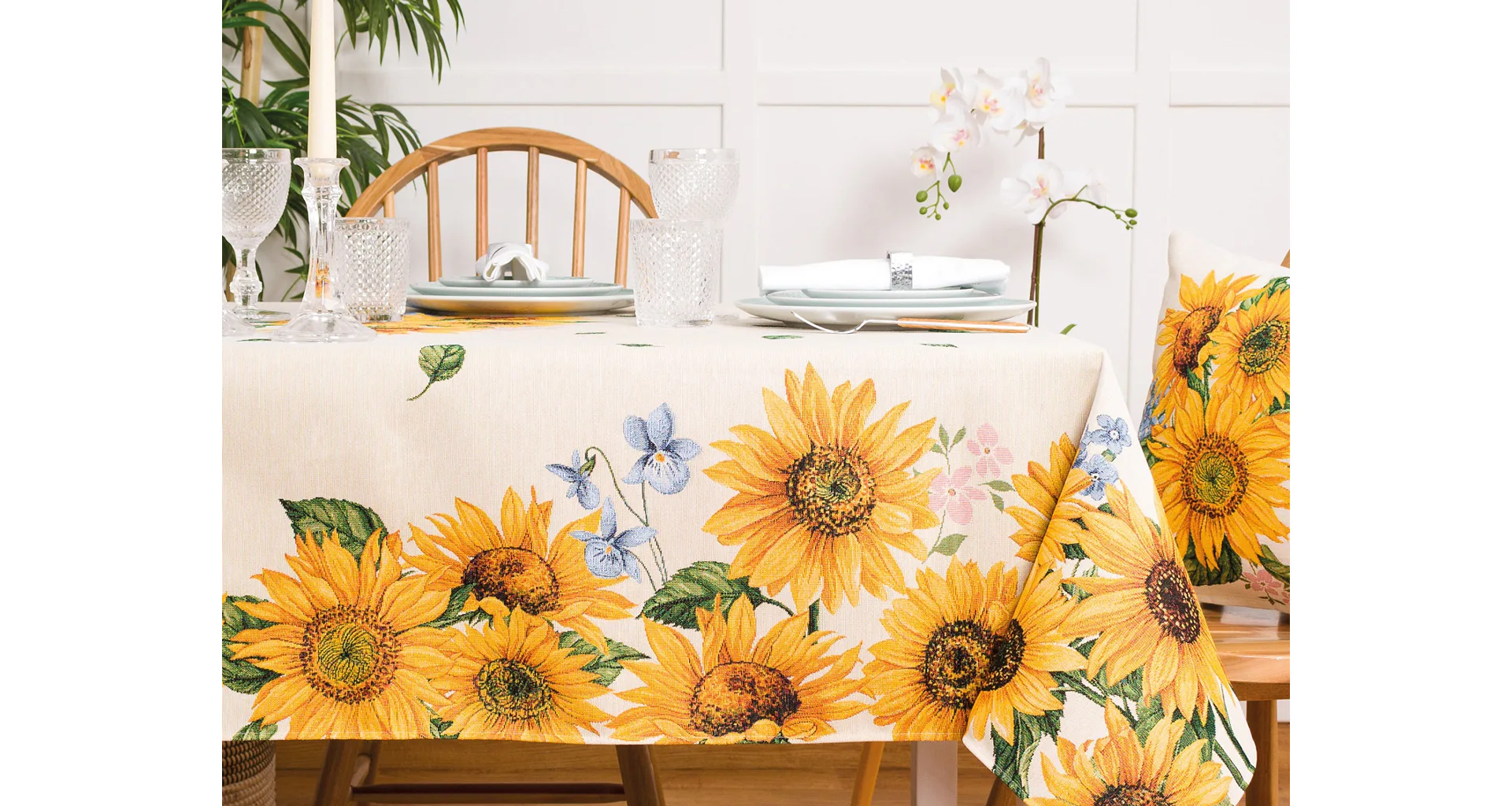 Ubrus Flora zdobený květy slunečnic je ideální doplněk pro každou příležitost. Originální design s rustikálním nádechem se pojí s praktičností díky pevnému a odolnému materiálu.