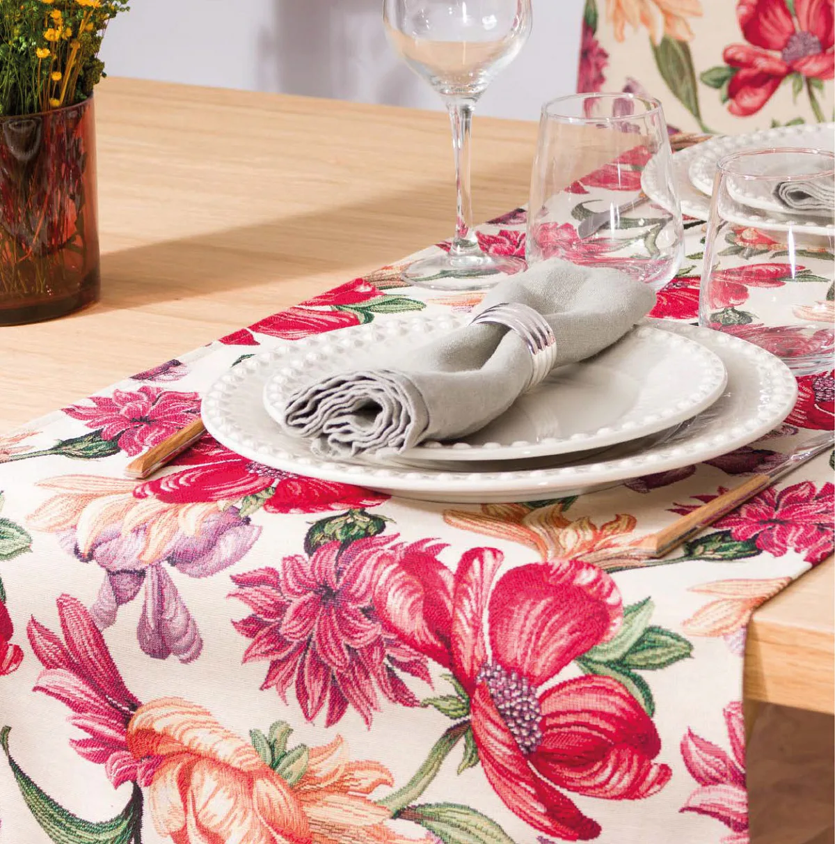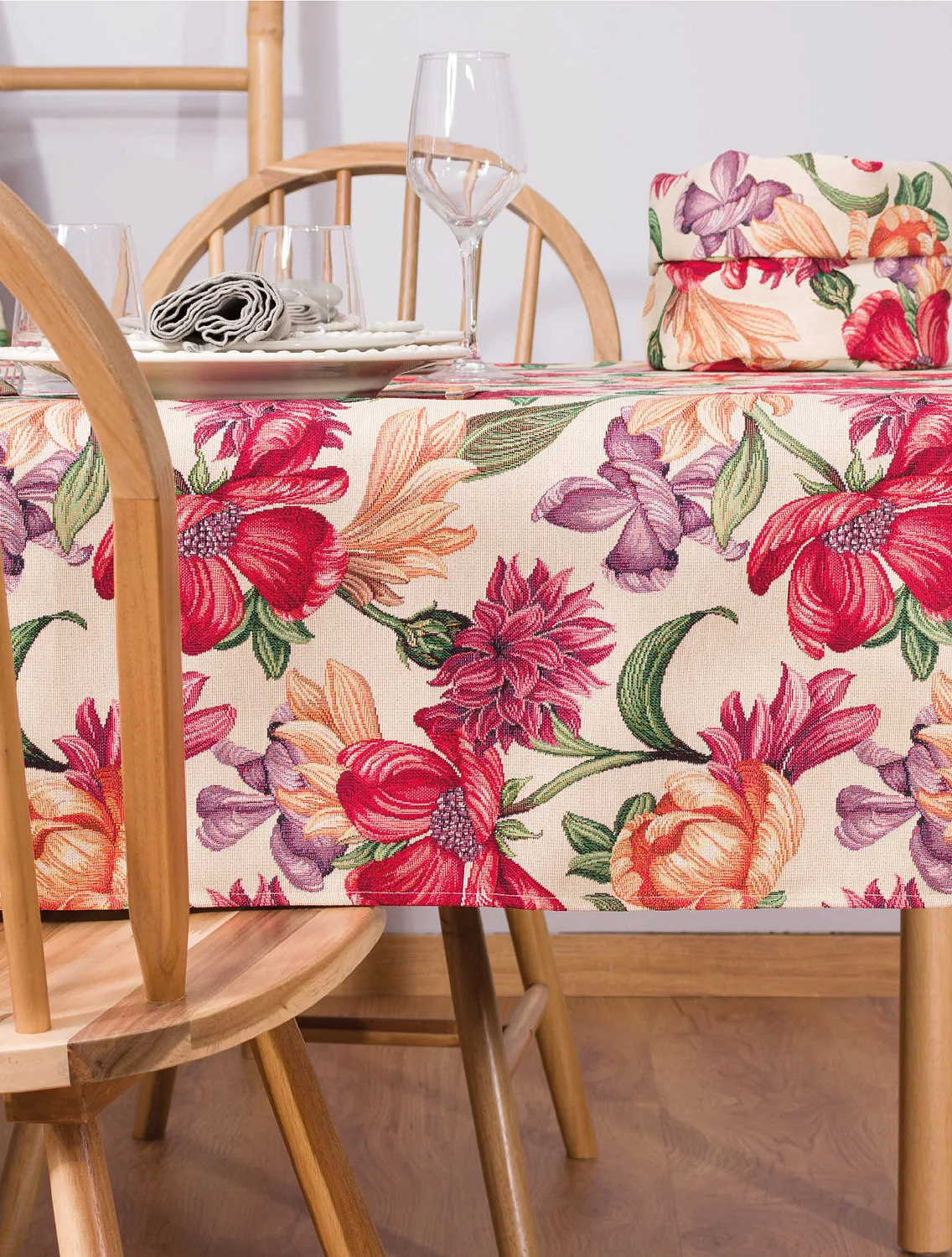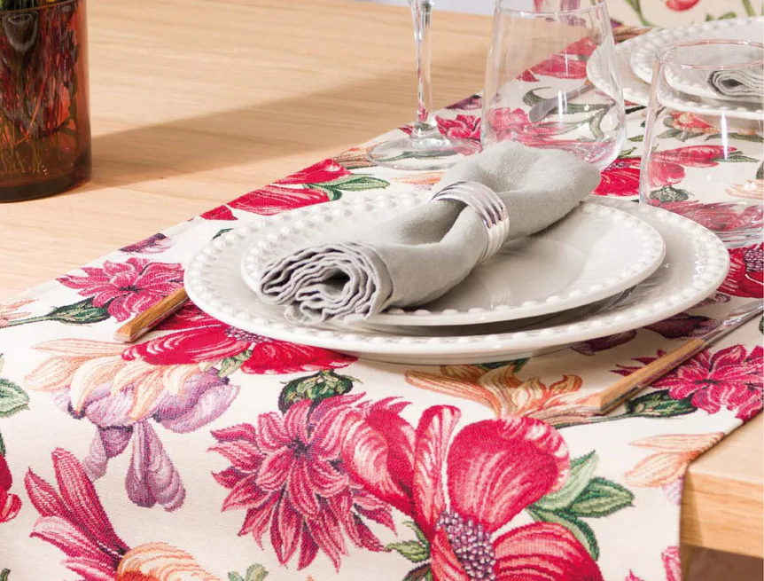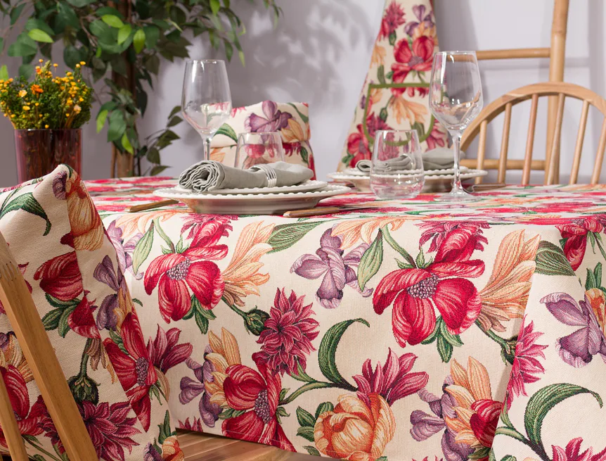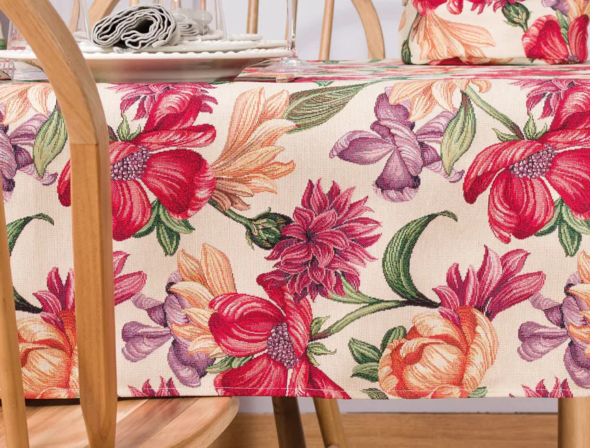 Ubrus Iris Allover s výraznými pestrobarevnými květy je ideální doplněk pro každou příležitost. Originální design s rustikálním nádechem se pojí s praktičností díky pevnému a odolnému materiálu.