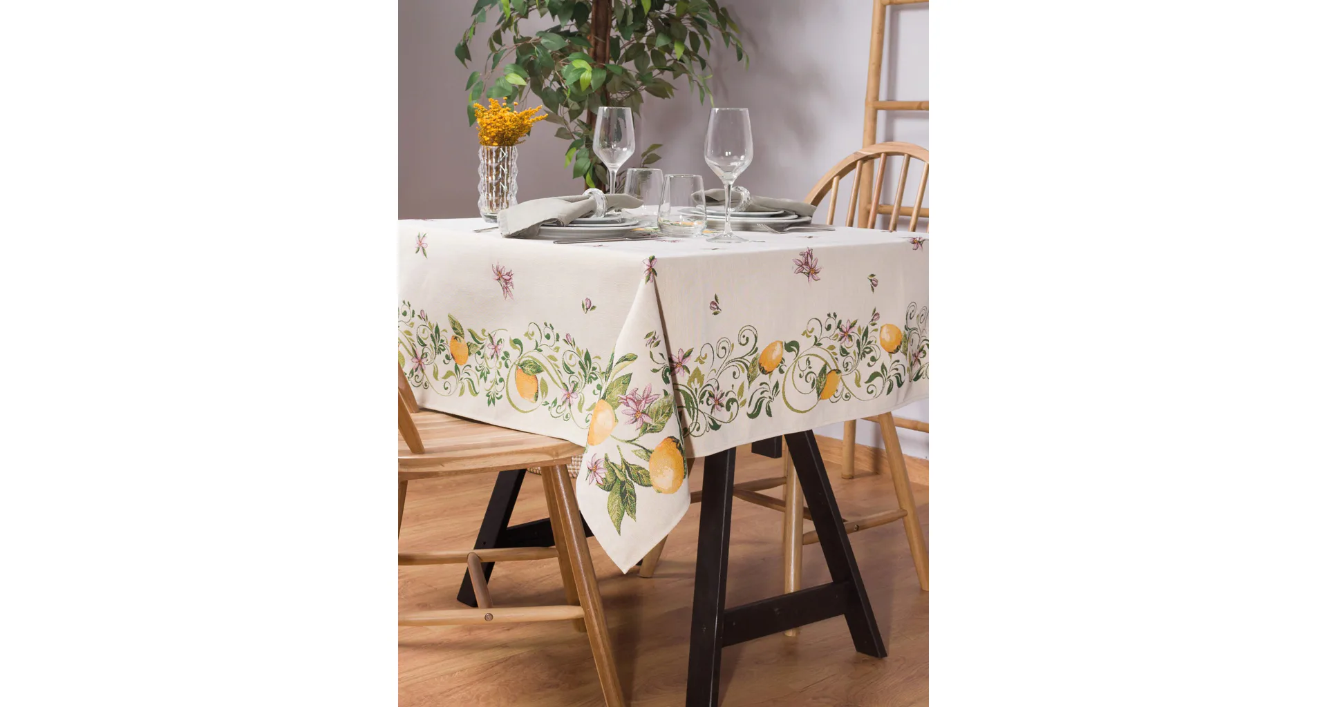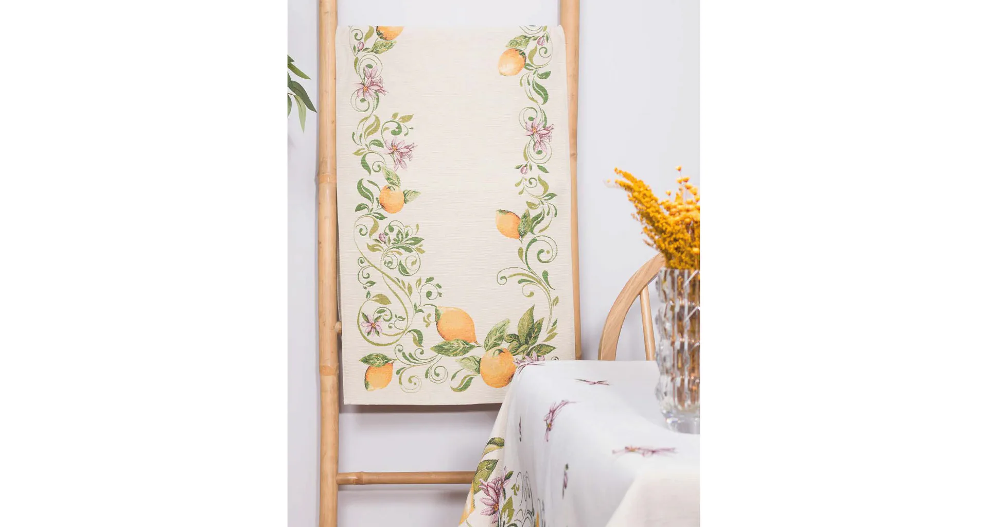 Ubrus Lima zdobený citrusy a jemnými květy je ideální doplněk pro každou příležitost. Elegantní design s rustikálním nádechem se pojí s praktičností díky pevnému a odolnému materiálu.