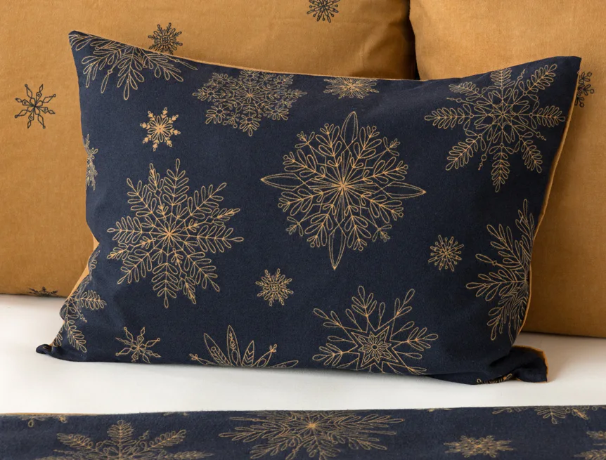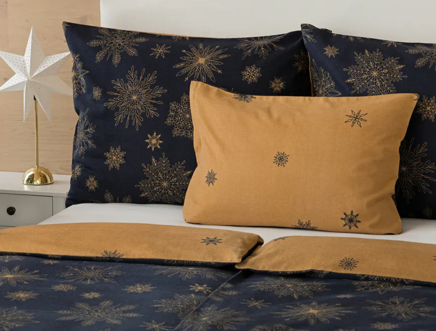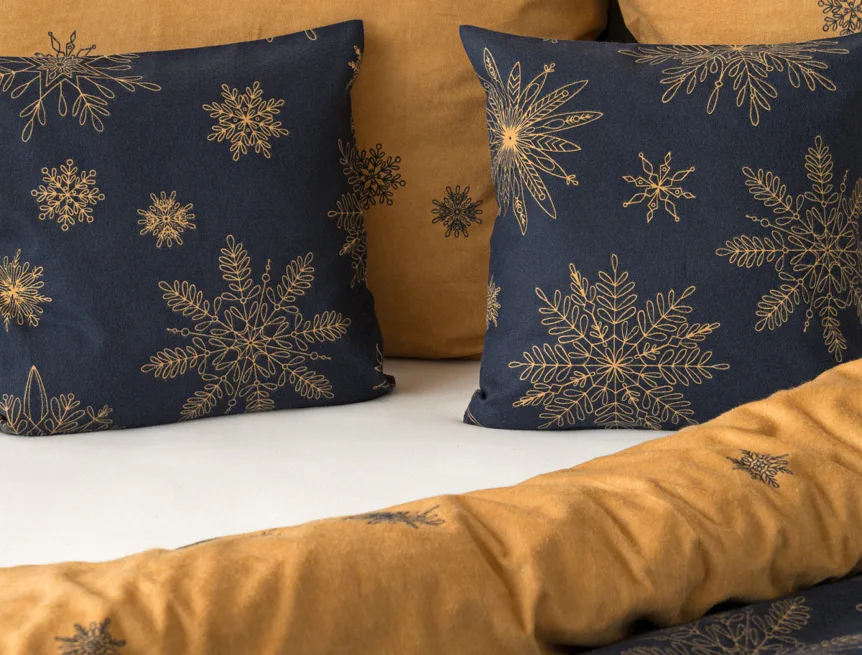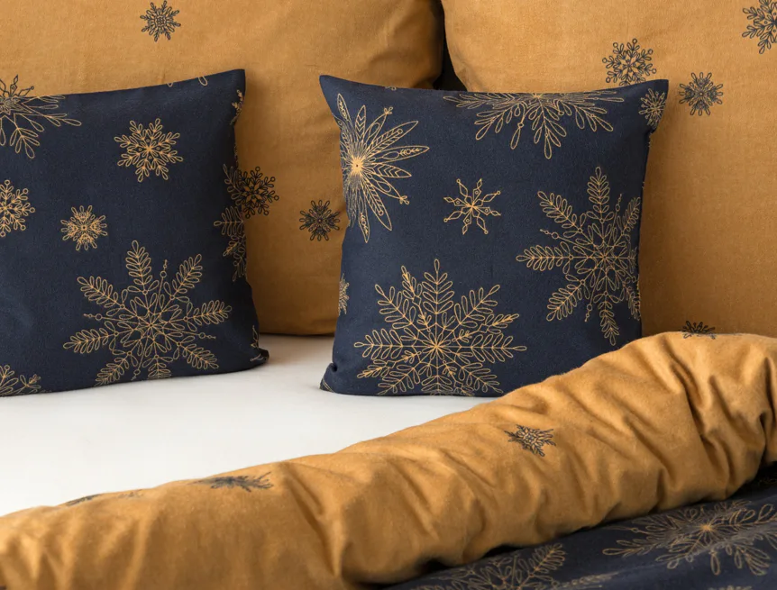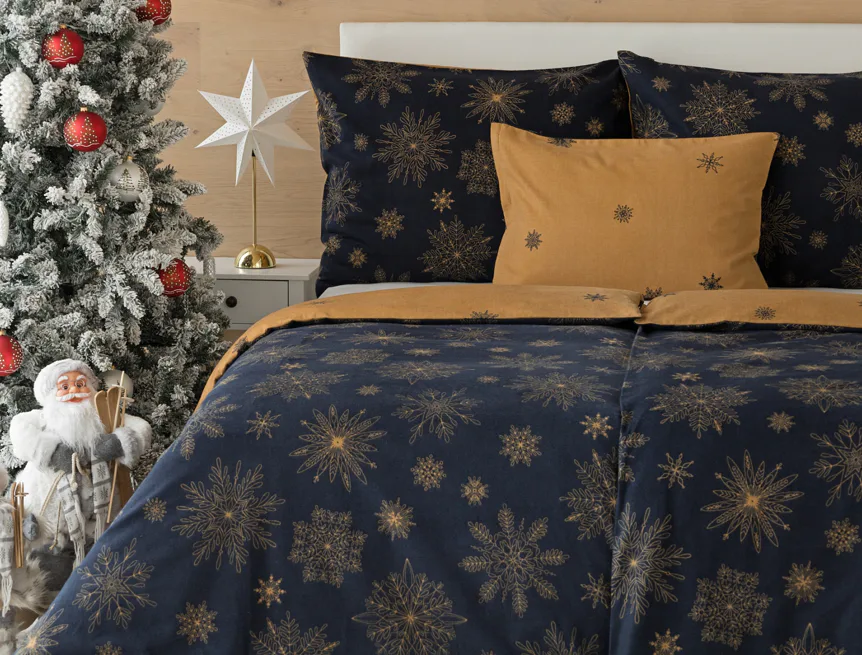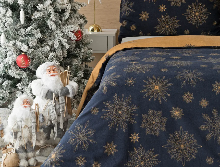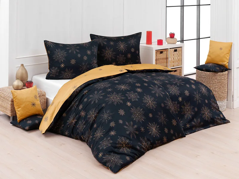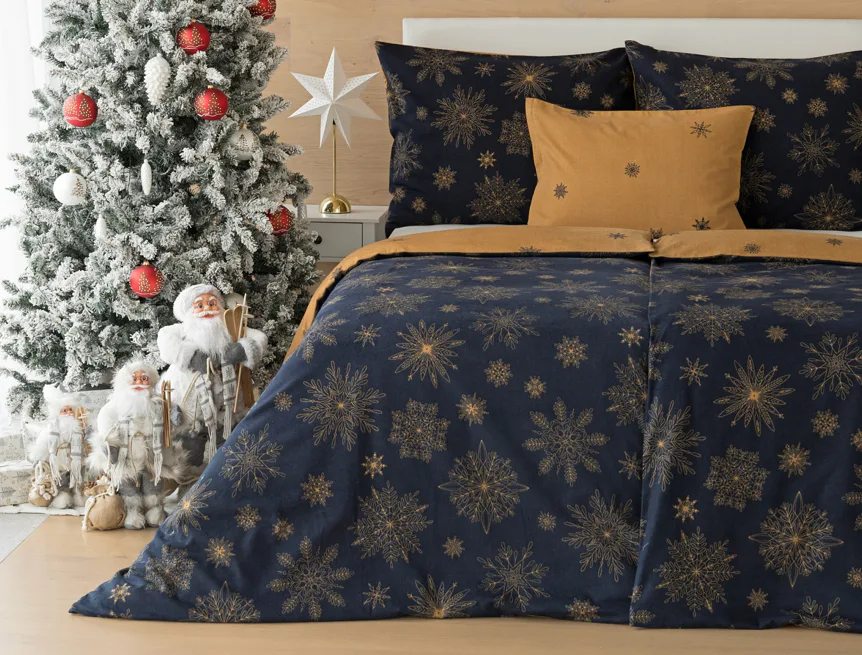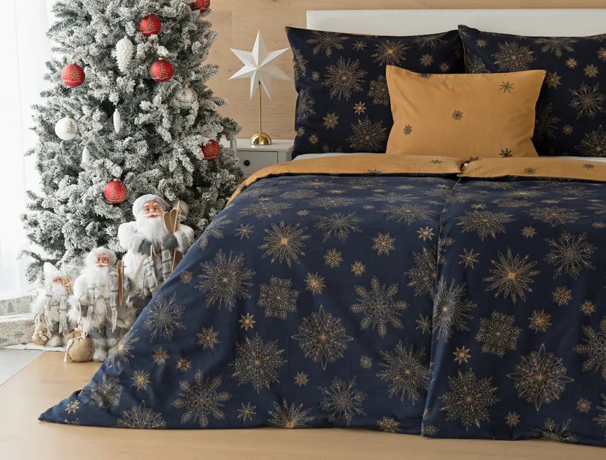 You can enjoy a warm Christmas atmosphere in your bedroom with the elegant Gold Christmas bedding. On one side, the dark blue background is decorated with a large number of gold flakes, the bottom side is made inversely, the blue flakes are here and there embedded in the golden background.
