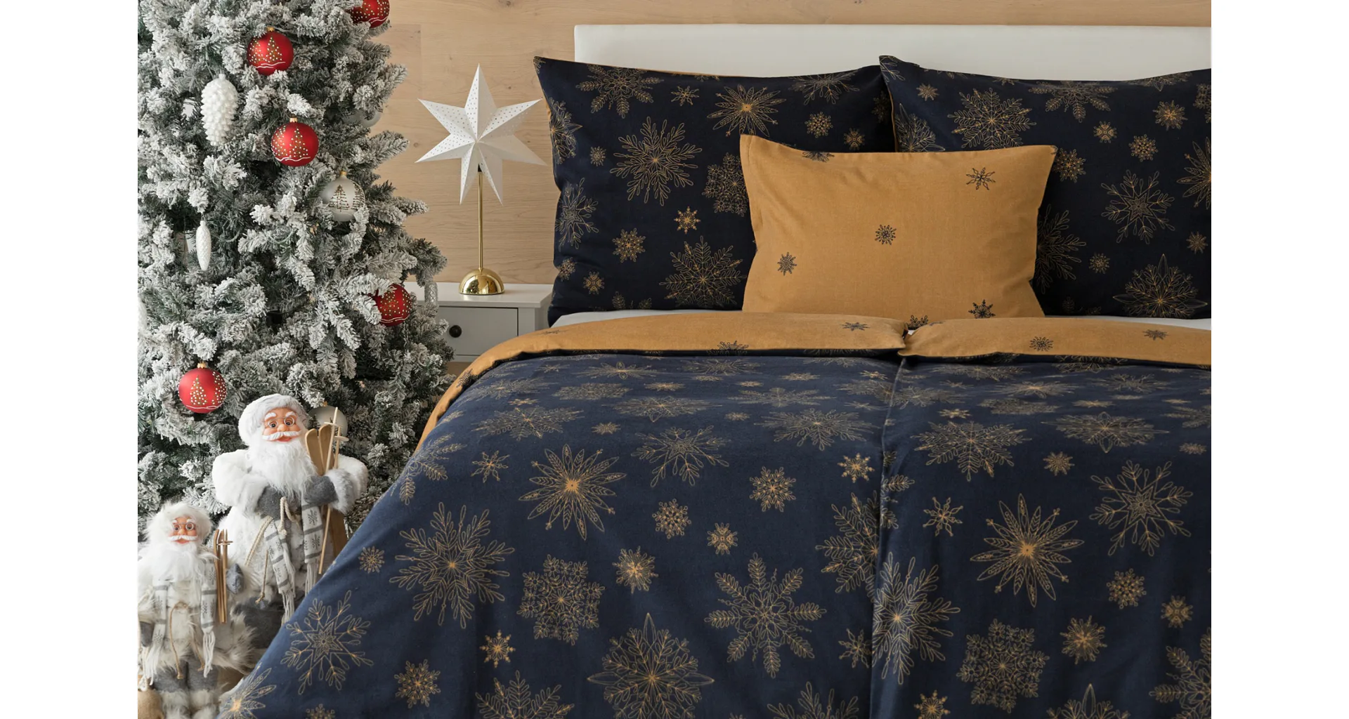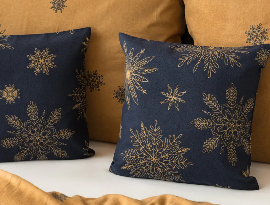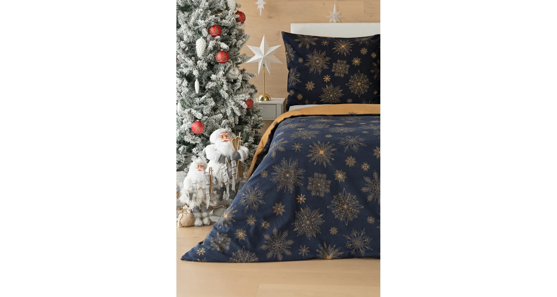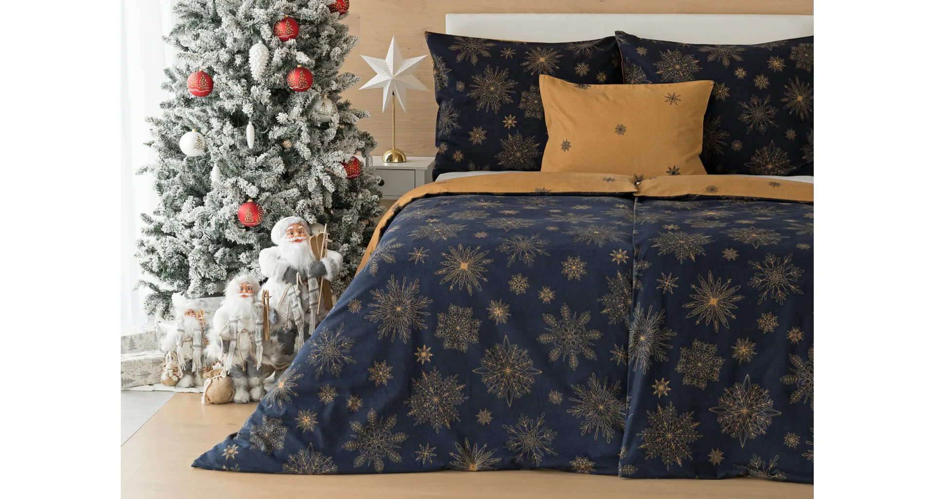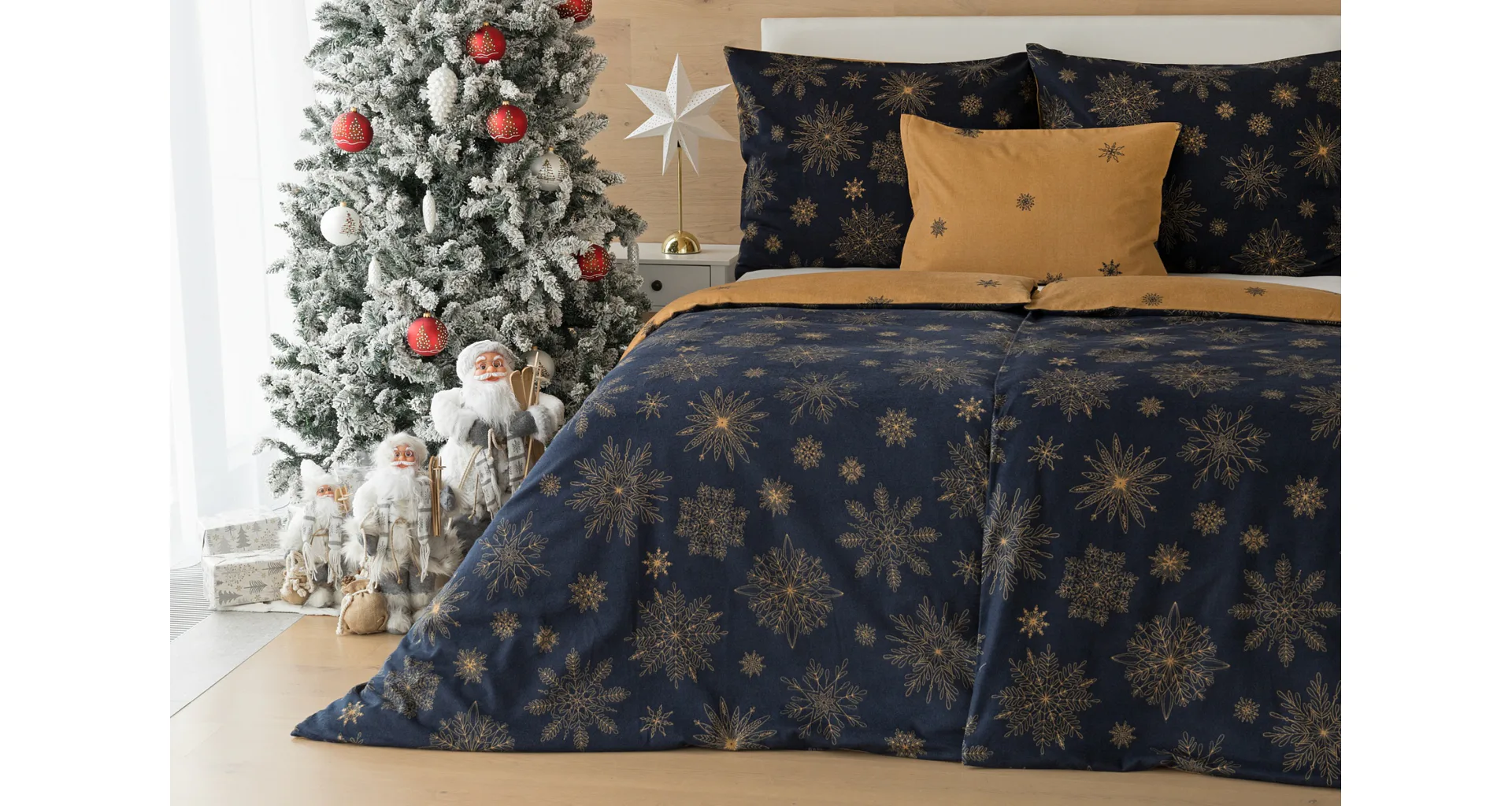 You can enjoy a warm Christmas atmosphere in your bedroom with the elegant Gold Christmas bedding. On one side, the dark blue background is decorated with a large number of gold flakes, the bottom side is made inversely, the blue flakes are here and there embedded in the golden background.