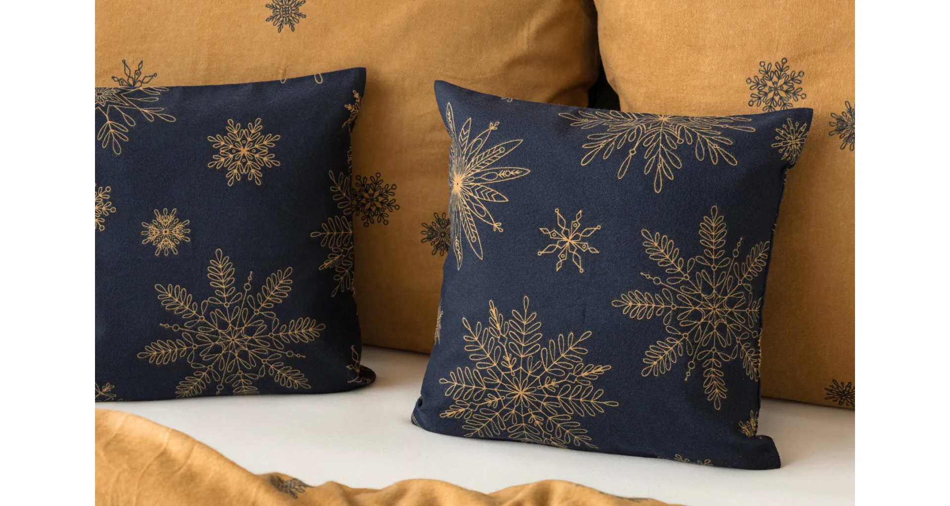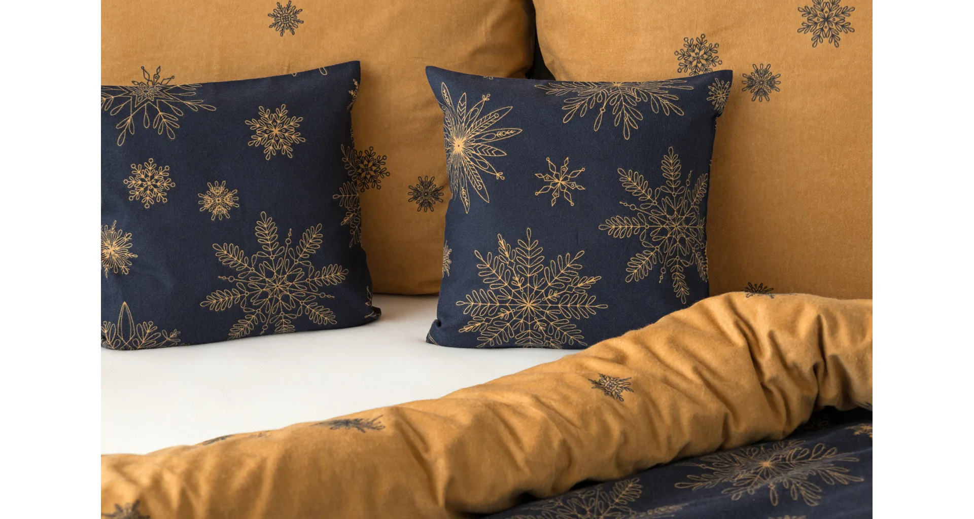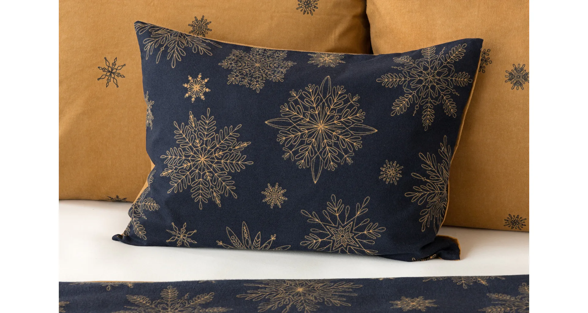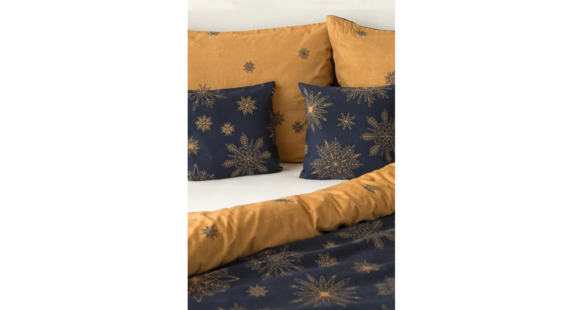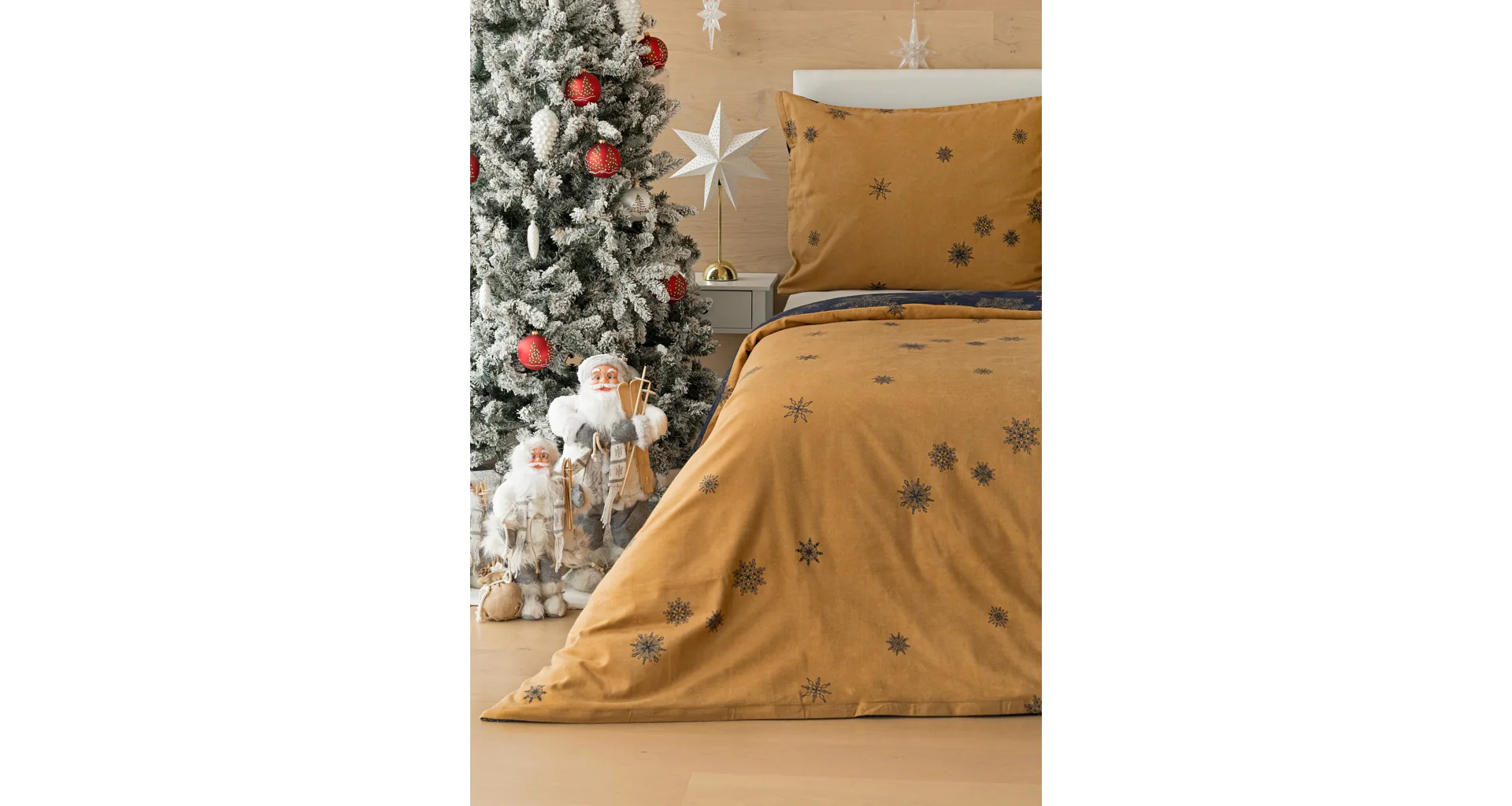 You can enjoy a warm Christmas atmosphere in your bedroom with the elegant Gold Christmas bedding. On one side, the dark blue background is decorated with a large number of gold flakes, the bottom side is made inversely, the blue flakes are here and there embedded in the golden background.