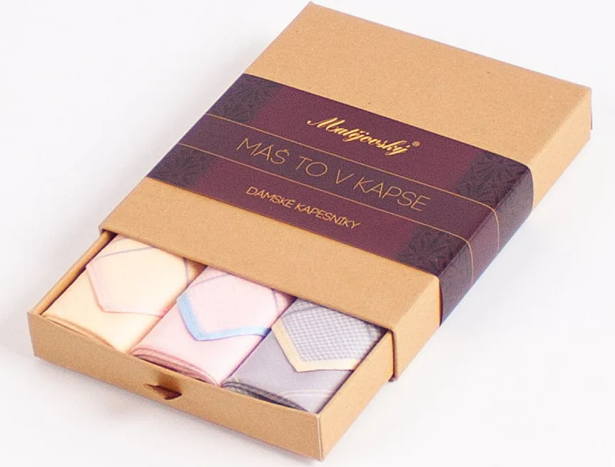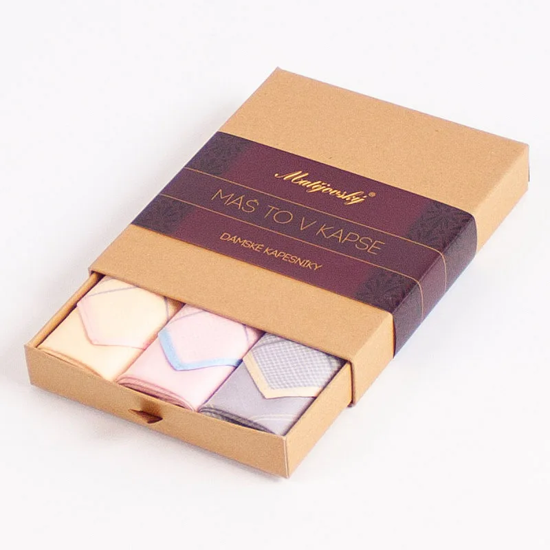 Elegance dotažená do posledního detailu. Tradiční bavlněný kapesník je nejen praktickým pomocníkem v celé řadě každodenních okamžiků, ale také symbolem elegance a vytříbeného stylu. Sada tří barevně sladěných látkových kapesníků, které vynikají hebkostí a savostí, se i díky originálnímu balení stane ideálním dárkem pro každou dámu.