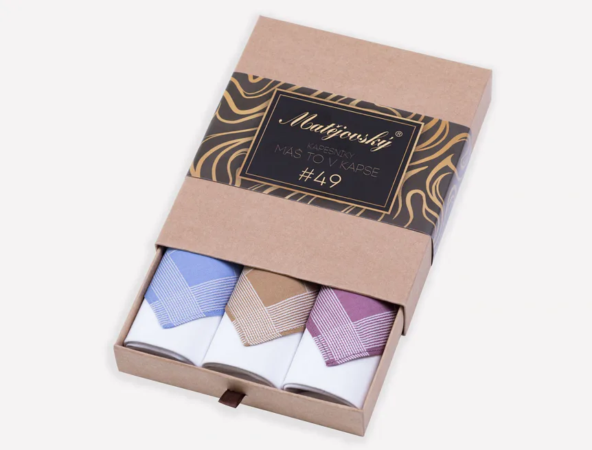 Elegance dotažená do posledního detailu. Tradiční bavlněný kapesník je nejen praktickým pomocníkem v celé řadě každodenních okamžiků, ale také symbolem elegance a vytříbeného stylu. Sada tří barevně sladěných látkových kapesníků, které vynikají hebkostí a savostí, se i díky originálnímu balení stane ideálním dárkem pro moderního gentlemana.