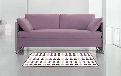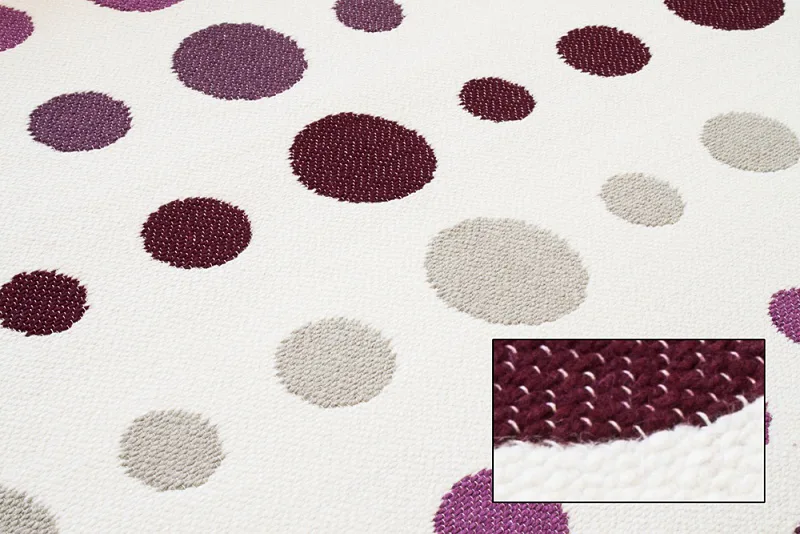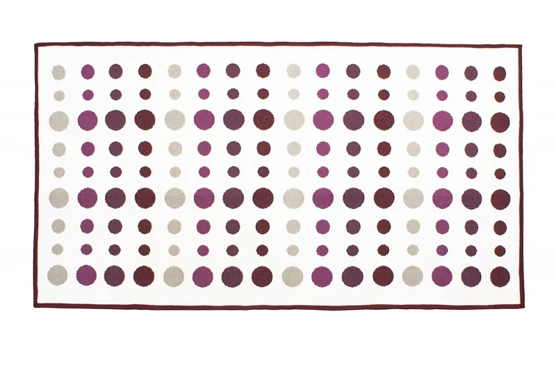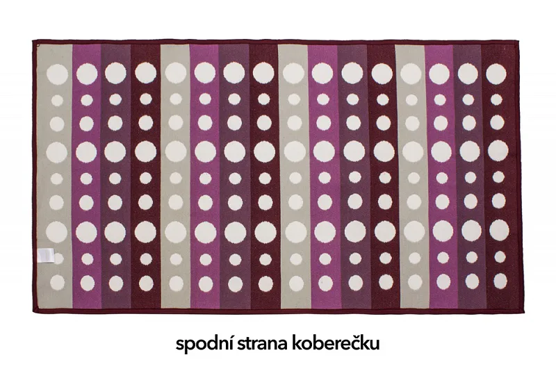 Dekorační tkaný kobereček s krásnou texturou je novinkou v sortimentu a doplňuje designové řady nejoblíbenějších geometrických motivů. Nyní si můžete sladit interiér opravdu do posledního detailu. Dezén MODERN ART LILA na první pohled zaujme atraktivním puntíkovým vzorem v nejrůznějších odstínech fialové na přírodním bílém podkladu. Druhá strana koberečku je provedena inverzně (bílé puntíky v barevných pruzích - viz další foto). Kobereček je po celém obvodu olemován barevně sladěnou lemovkou.