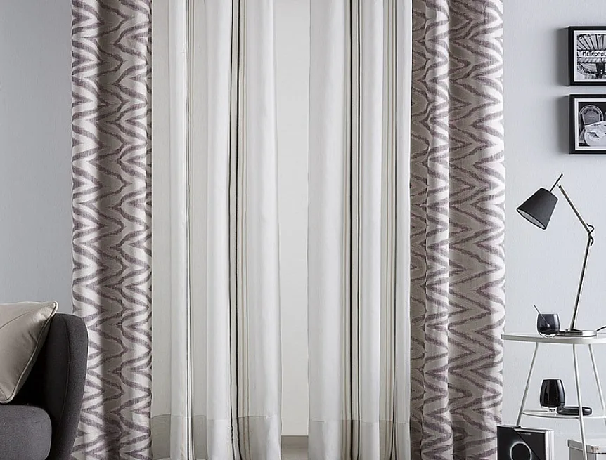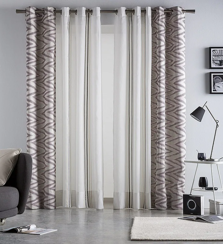 Limitovaná kolekce kombinovaných dekoračních závěsů přináší mimořádný designový kousek. Dodejte interiéru styl okouzlujícím závěsem ANABEL LILA. Dokonale sladěné odstíny starofialové a šedé barvy na částečně zatemňující designové části se skvěle doplňují s průhledným bílým tylem zdobeným svislými starofialovými a šedobéžovými proužky. Obě části na sebe plynule navazují a tvoří tak originální celek. Jemný matný lesk dodává kombinovanému závěsu nadčasovou eleganci.