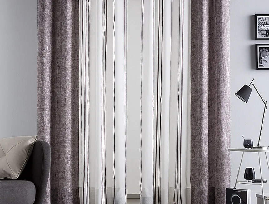 Limitovaná kolekce kombinovaných dekoračních závěsů přináší mimořádný designový kousek. Dodejte interiéru styl okouzlujícím závěsem MARTINA LILA. Dokonale sladěné odstíny starofialové a šedé barvy na částečně zatemňující designové části se skvěle doplňují s průhledným bílým tylem zdobeným svislými starofialovými a šedobéžovými proužky. Obě části na sebe plynule navazují a tvoří tak originální celek. Jemný matný lesk dodává kombinovanému závěsu nadčasovou eleganci.