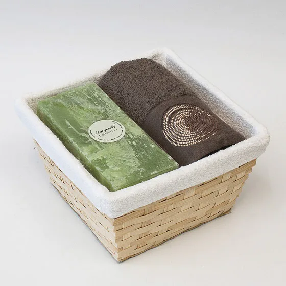 Balení obsahuje barevně sladěný set ručníku a ručně vyráběné vonné svíčky.