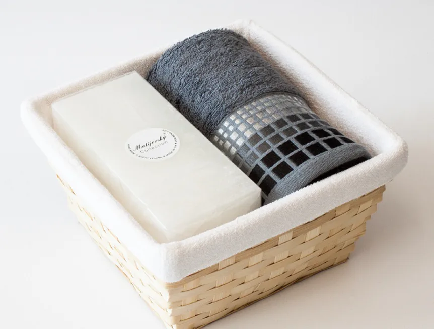 Proutěný košík a bílá textilní vsadka jsou součástí dárkového balení.