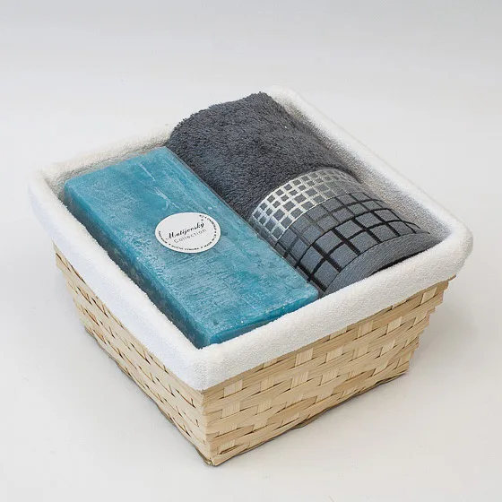 Balení obsahuje barevně sladěný set ručníku a ručně vyráběné vonné svíčky.