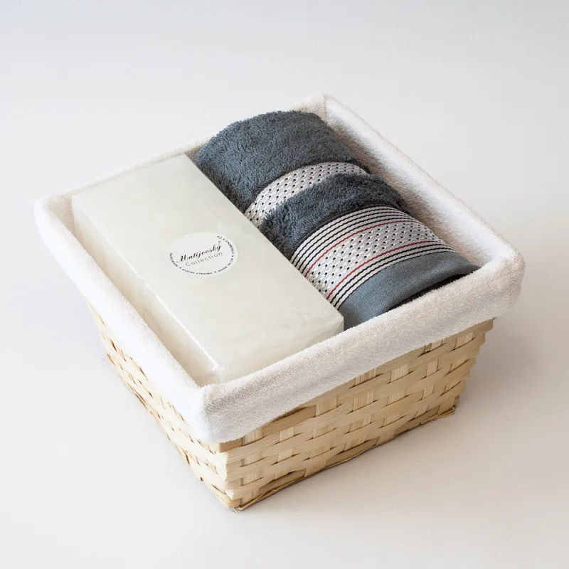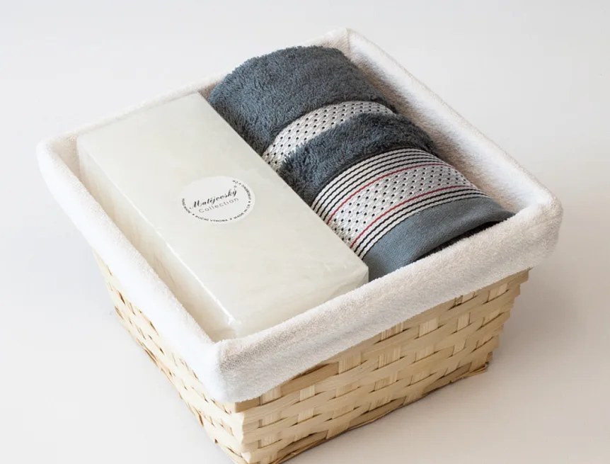 Proutěný košík a bílá textilní vsadka jsou součástí dárkového balení.