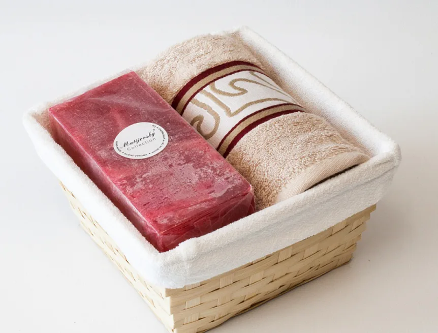 Balení obsahuje barevně sladěný set ručníku a ručně vyráběné vonné svíčky.