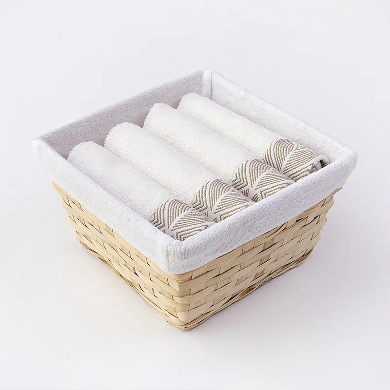 Košík s textilní vsadkou je součástí balení. Ručníky jsou opatřeny poutkem.