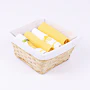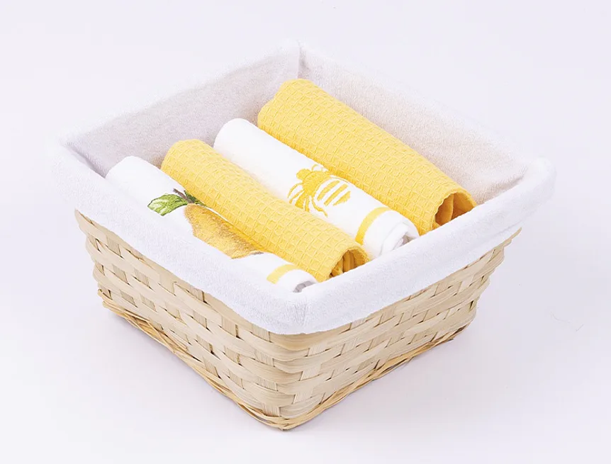 Proutěný košík s textilní vsadkou je spolu s utěrkami zabalen v celofánu a doplněn ozdobnou mašlí.