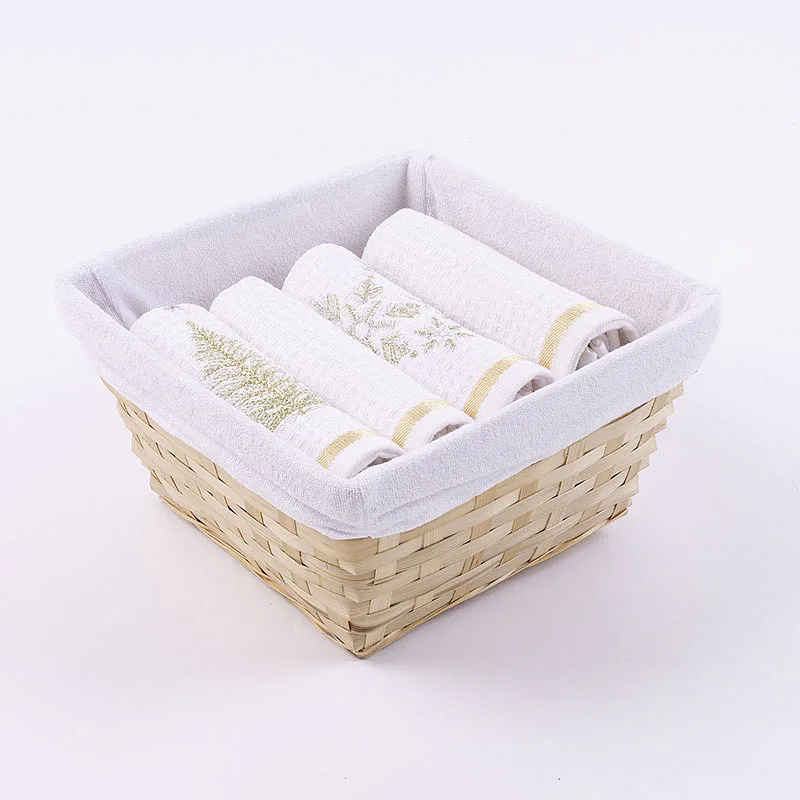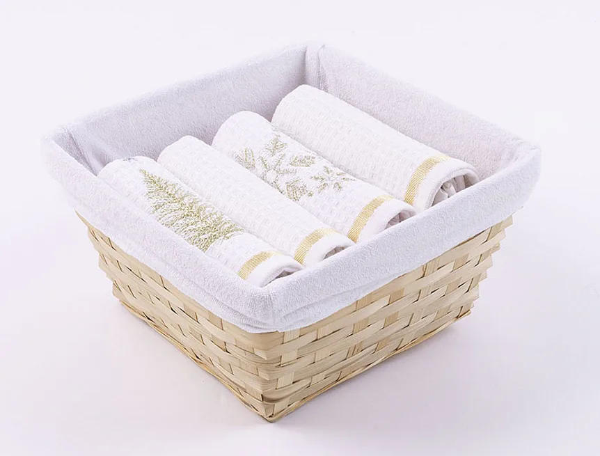 Proutěný košík s textilní vsadkou je spolu s utěrkami zabalen v celofánu a doplněn ozdobnou mašlí.
