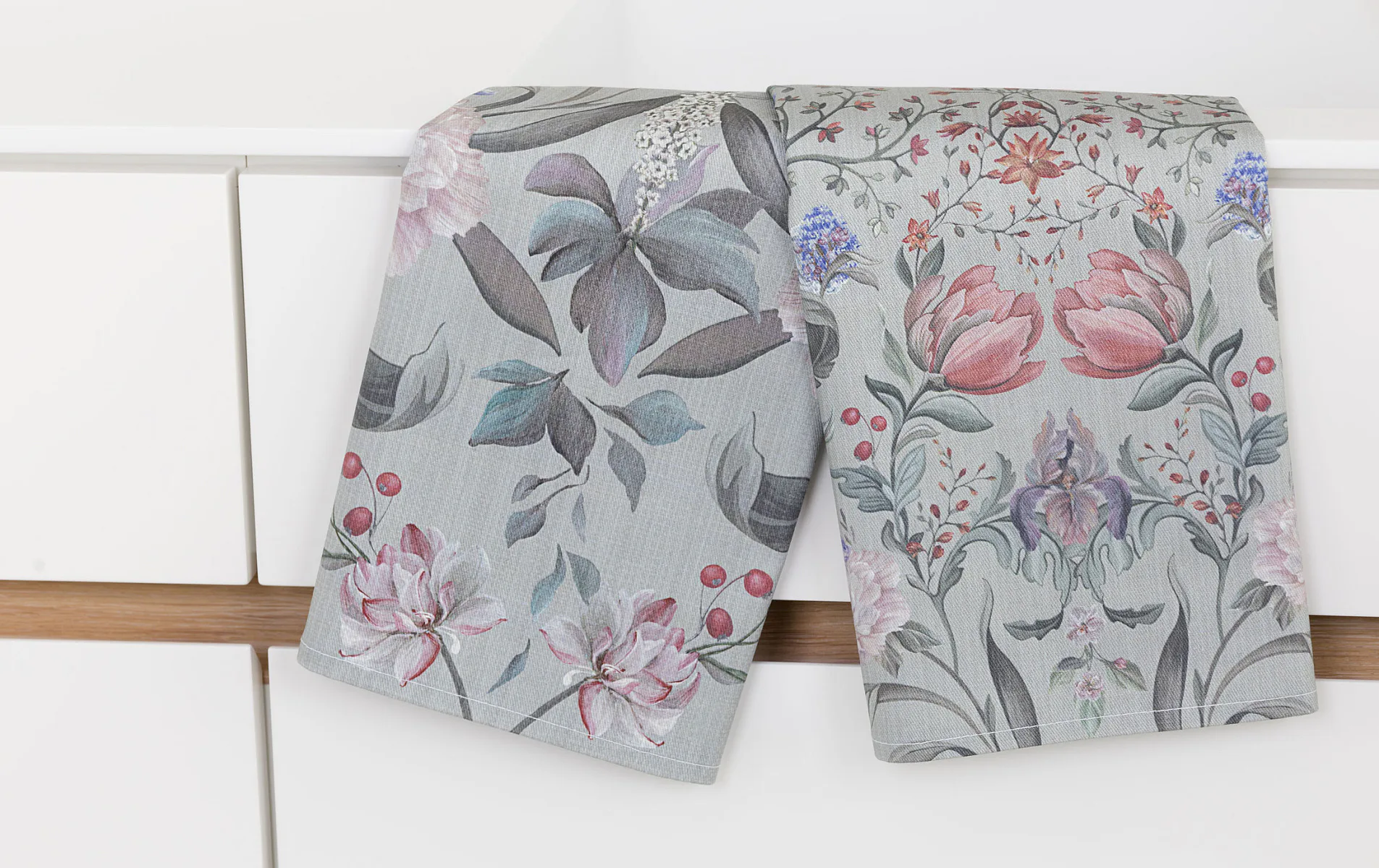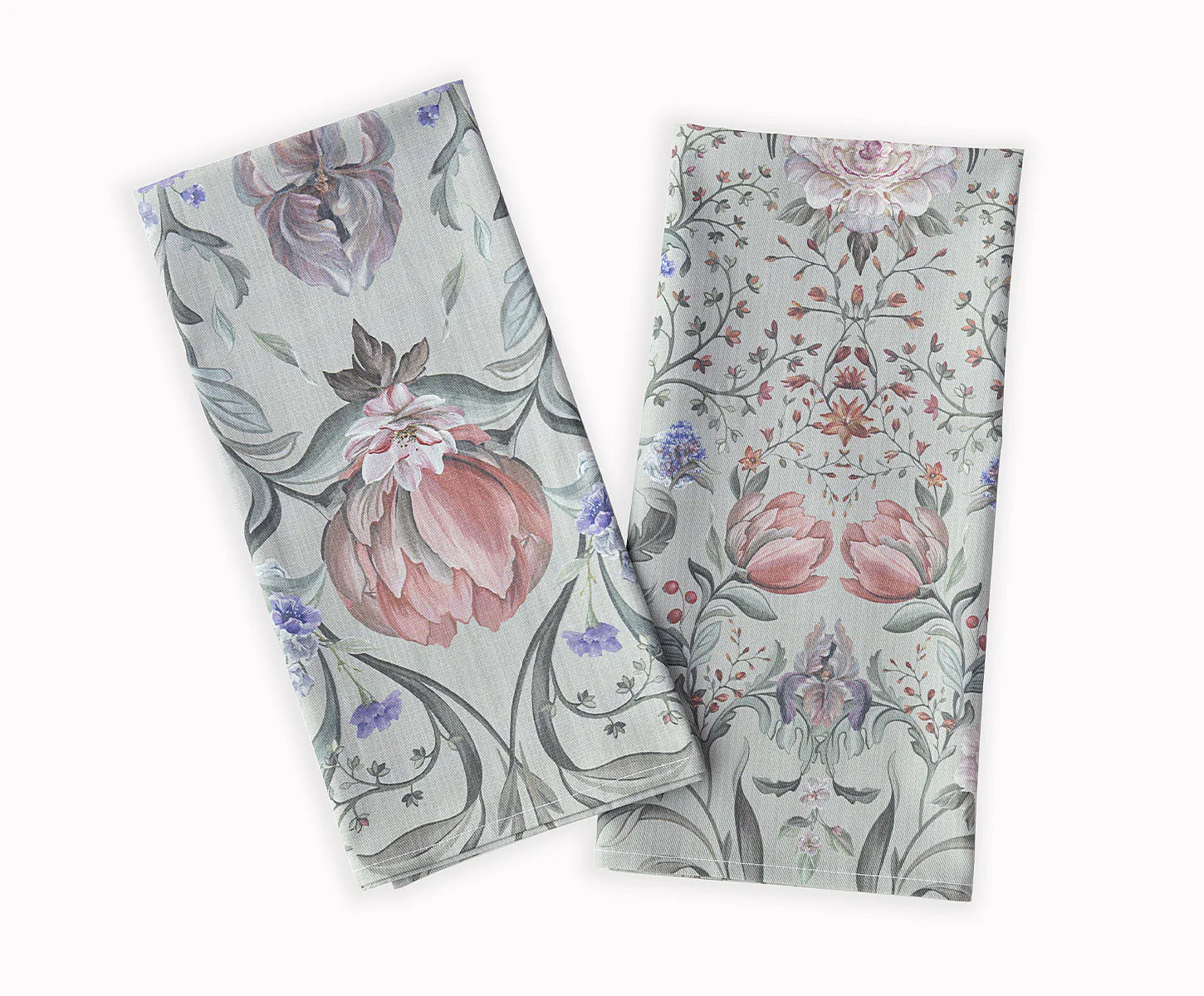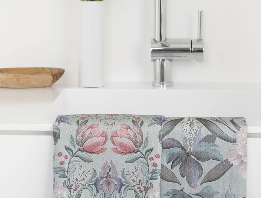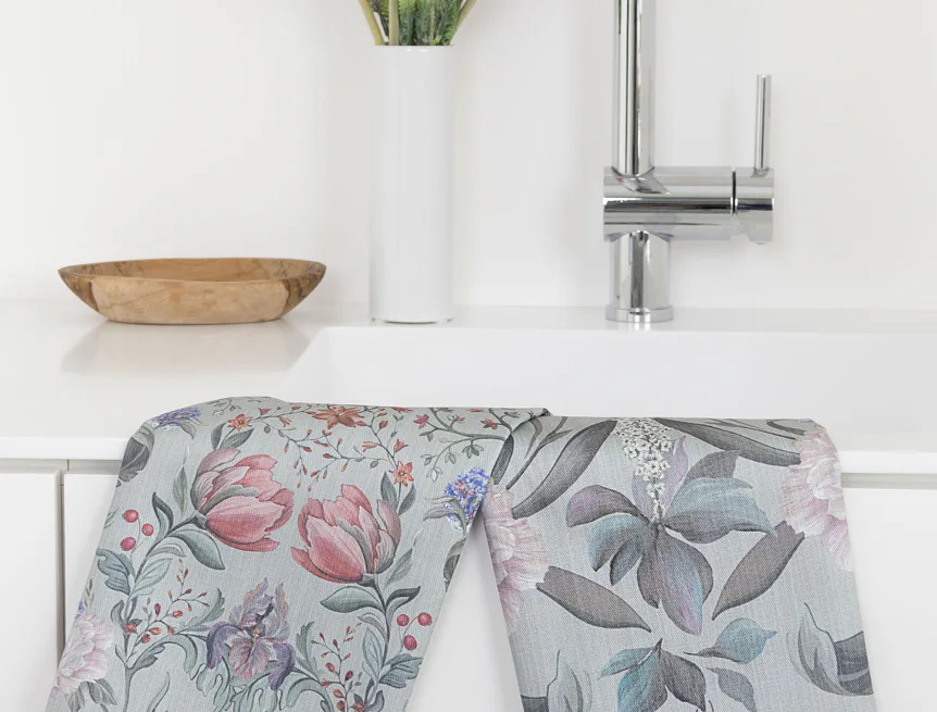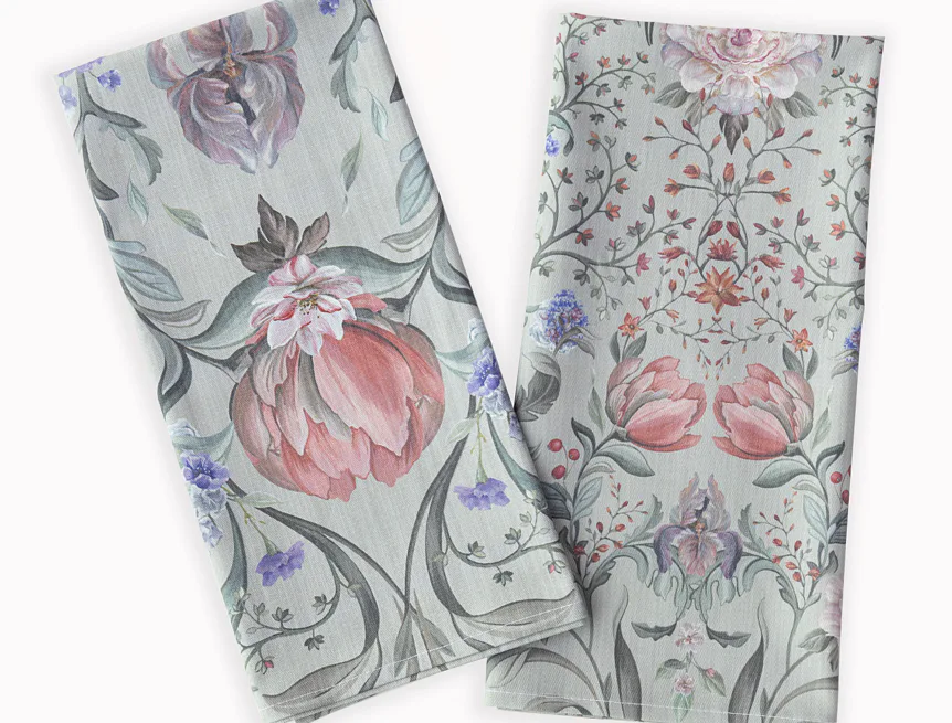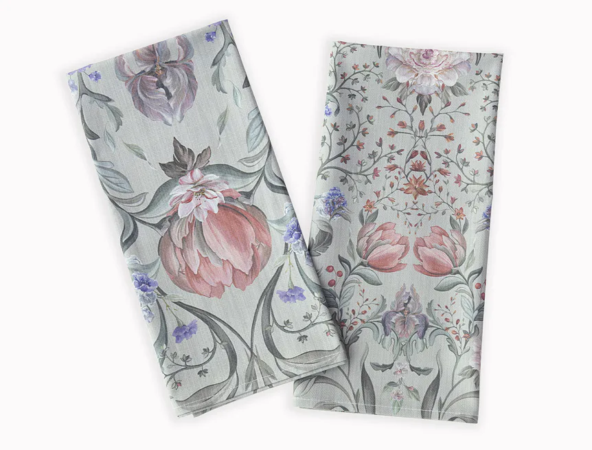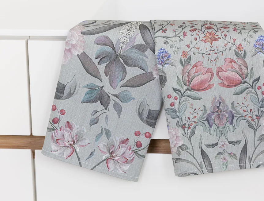 Potisk: jednostranný, obě utěrky zachycují stejný florální motiv s odlišnou velikostí květin